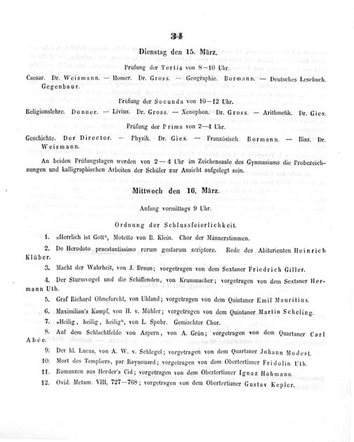 2. De Herodoto praestantissimo rerum gestarum scriptore. Rede des Abiturienten Heinrich Klüber. 3. Macht der Wahrheit, von J. Braun; vorgetragen von dem Sextaner Friedrich Giller.
