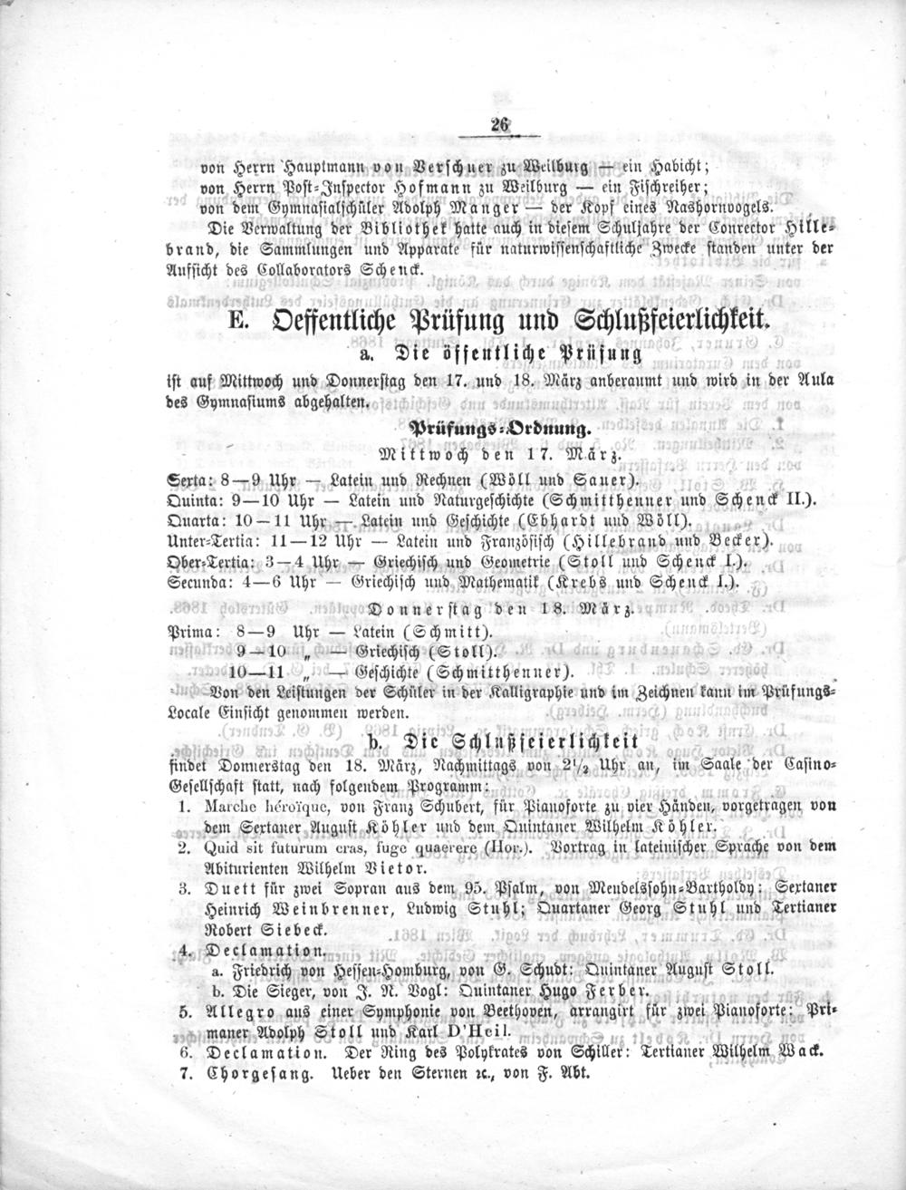 E. Oeffentliche Prüfung und Schlußfeierlichkeit. a. Die öffentliche Prüfung iſt auf Mittwoch und Donnerſtag den 17. und 18. März anberaumt und wird in der Aula des Gymnaſiums abgehalten.