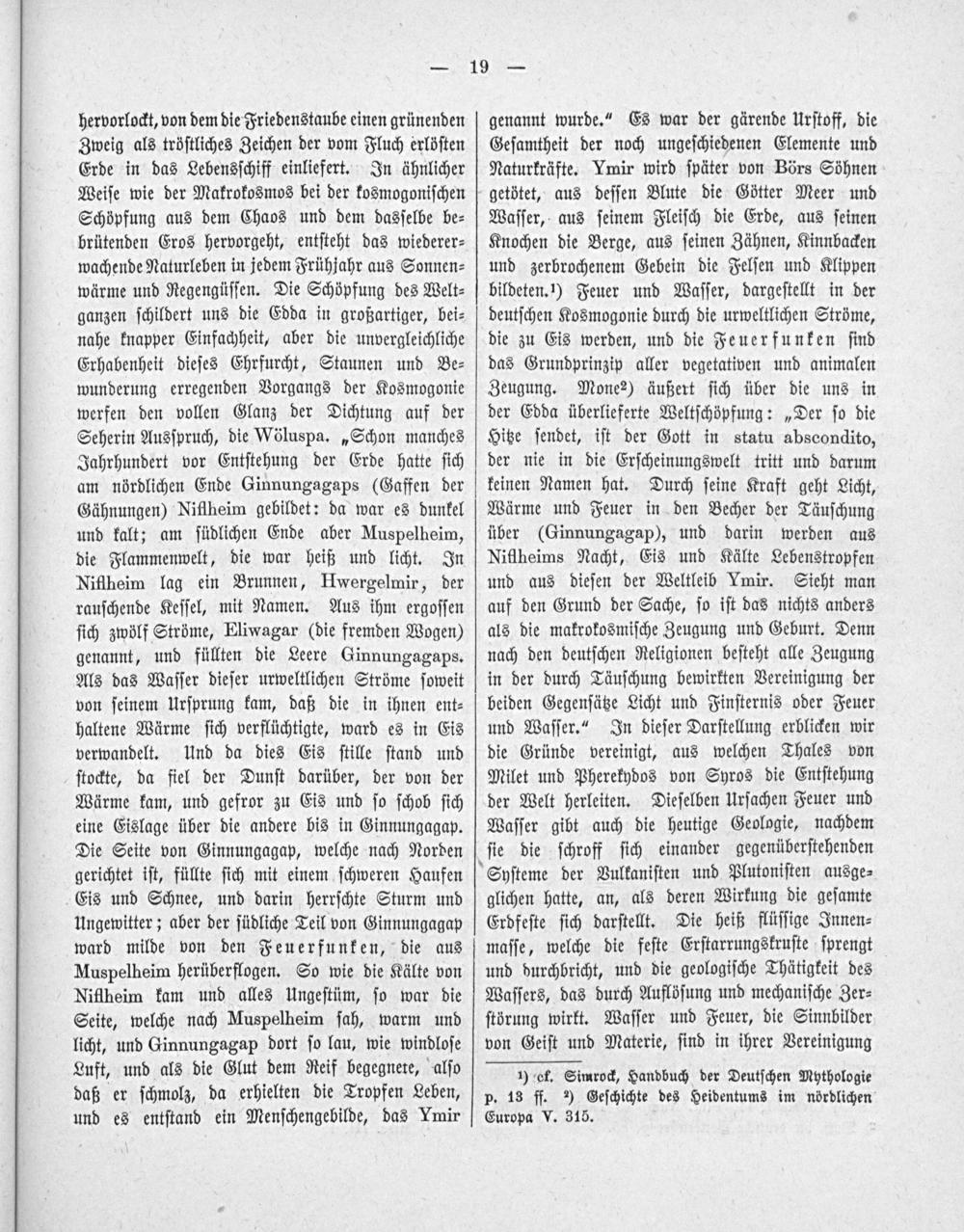 genannt wurde.“ Es war der gärende Urſtoff, die Geſamtheit der noch ungeſchiedenen Elemente und Naturkräfte. Ymir wird ſpäter von Börs Söhnen getötet, aus deſſen Blute die Götter Meer und Waſſer, aus ſeinem Fleiſch die Erde, aus ſeinen Knochen die Berge, aus ſeinen Zähnen, Kinnbacken und zerbrochenem Gebein die Felſen und Klippen bildeten..) Feuer und Waſſer, dargeſtellt in der deutſchen Kosmogonie durch die urweltlichen Ströme, die zu Eis werden, und die Feuerfunken ſind das Grundprinzip aller vegetativen und animalen Zeugung. Mone?) äußert ſich über die uns in der Edda überlieferte Weltſchöpfung:„Der ſo die Hitze ſendet, iſt der Gott in statu abscondito, der nie in die Erſcheinungswelt tritt und darum keinen Namen hat. Durch ſeine Kraft geht Licht, Wärme und Feuer in den Becher der Täuſchung über(Ginnungagap), und darin werden aus Niflheims Nacht, Eis und Kälte Lebenstropfen und aus dieſen der Weltleib Ymir. Sieht man auf den Grund der Sache, ſo iſt das nichts anders als die makrokosmiſche Zeugung und Geburt. Denn nach den deutſchen Religionen beſteht alle Zeugung in der durch Täuſchung bewirkten Vereinigung der beiden Gegenſätze Licht und Finſternis oder Feuer und Waſſer.“ In dieſer Darſtellung erblicken wir die Gründe vereinigt, aus welchen Thales von Milet und Pherekydos von Syros die Entſtehung der Welt herleiten. Dieſelben Urſachen Feuer und Waſſer gibt auch die heutige Geologie, nachdem ſie die ſchroff ſich einander gegenüberſtehenden Syſteme der Vulkaniſten und Plutoniſten ausge⸗ glichen hatte, an, als deren Wirkung die geſamte Erdfeſte ſich darſtellt. Die heiß flüſſige Innen⸗ maſſe, welche die feſte Erſtarrungskruſte ſprengt und durchbricht, und die geologiſche Thätigkeit des Waſſers, das durch Auflöſung und mechaniſche Zer⸗ ſtörung wirkt. Waſſer und Feuer, die Sinnbilder von Geiſt und Materie, ſind in ihrer Vereinigung