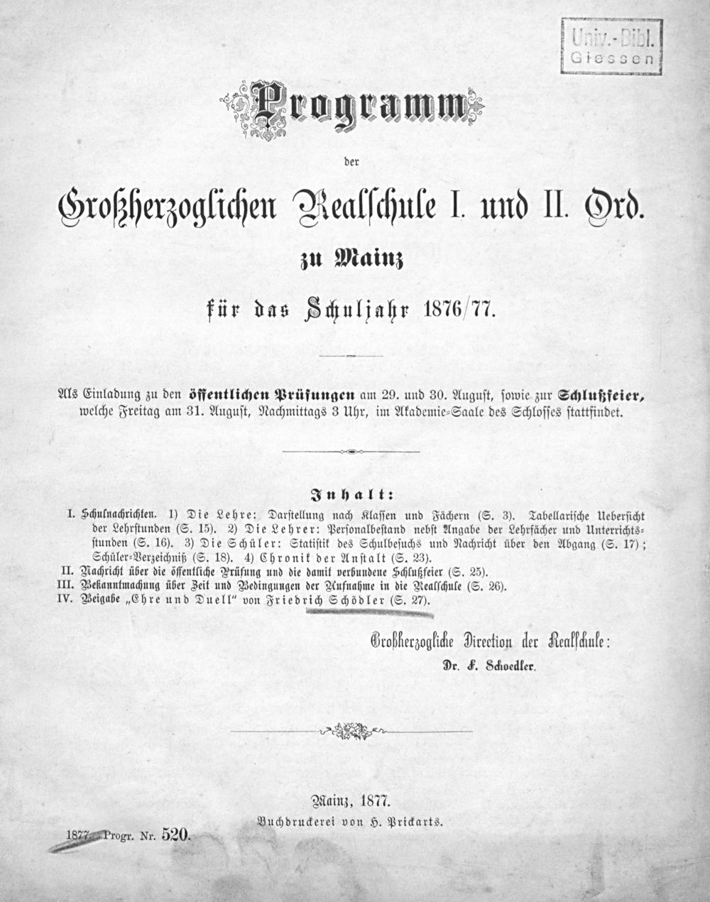 II. Nachricht über die öffentliche Prüfung und die damit verbundene Schlußfeier(S. 25). III. Bekanntmachung über Zeit und Bedingungen der Aufnahme in die Realſchule(S. 26). IV. Beigabe„Ehre und Duell“ von Friedrich Schödler(S. 27).