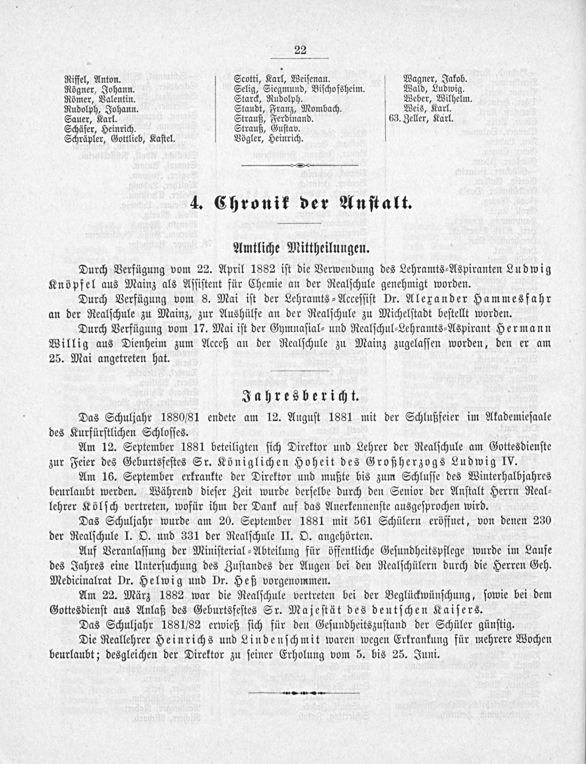Am 12. September 1881 beteiligten ſich Direktor und Lehrer der Realſchule am Gottesdienſte zur Feier des Geburtsfeſtes Sr. Königlichen Hoheit des Großherzogs Ludwig IV.