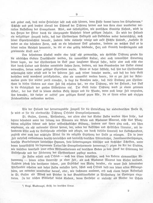 Zu Fulda erhielt auch Otfried— nach den Einen fränkiſcher, nach den Andern alemanniſcher Ab⸗ ſtammung— ſeinen erſten Unterricht zu einer Zeit, als noch Rhabanus Maurus dem Kloſter vorſtand. Nachdem jedoch ſein berühmter Lehrer, zum Erzbiſchof von Mainz berufen, ein neues Feld bedeutender Wirkſamkeit erhalten und daher Fulda verlaſſen hatte, ſchied auch Otfried bald von ſeiner erſten Bildungs⸗ ſtätte, um entweder unmittelbar darauf, oder, wie Lachmann annimmt, erſt nach einem kurzen Aufenthalt in St. Gallen als Mönch und Prieſter in das Benediktinerkloſter zu Weißenburg im Speiergau einzu⸗ treten. In der reichen Bibliothek dieſes Kloſters, deren Vorſteher er vielleicht als Meiſter der Schule