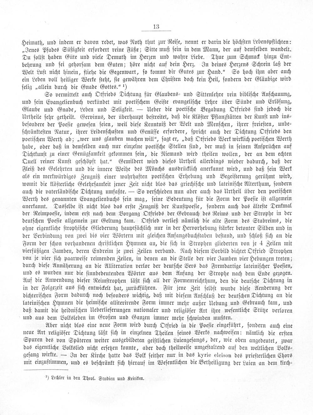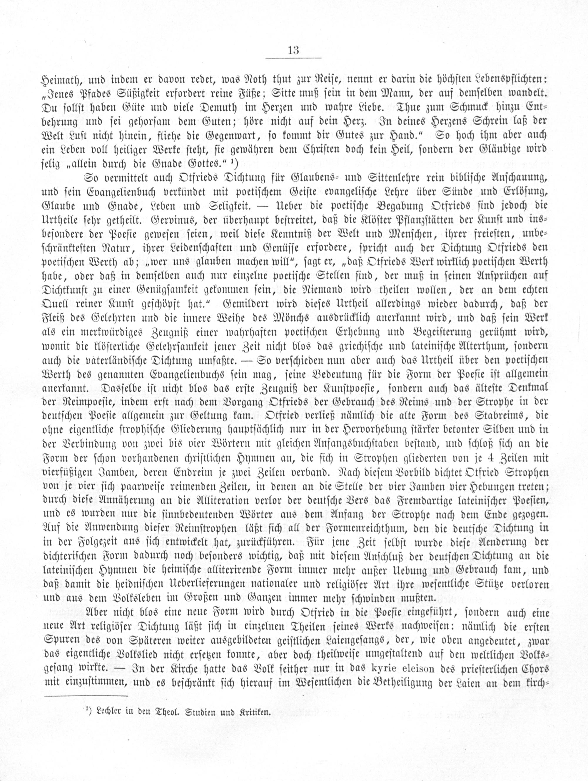 Aber nicht blos eine neue Form wird durch Otfried in die Poeſie eingeführt, ſondern auch eine neue Art religiöſer Dichtung läßt ſich in einzelnen Theilen ſeines Werks nachweiſen: nämlich die erſten Spuren des von Späteren weiter ausgebildeten geiſtlichen Laiengeſangs, der, wie oben angedeutet, zwar das eigentliche Volkslied nicht erſetzen konnte, aber doch theilweiſe umgeſtaltend auf den weltlichen Volks⸗ geſang wirkte.— In der Kirche hatte das Volk ſeither nur in das kyrie eleison des prieſterlichen Chors mit einzuſtimmen, und es beſchränkt ſich hierauf im Weſentlichen die Betheiligung der Laien an dem kirch⸗