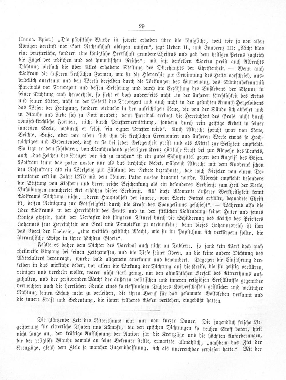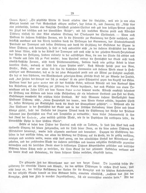 Fehlte es daher dem Dichter des Parcival auch nicht an Tadlern, ſo fand ſein Werk doch auch theilweiſe Eingang bei ſeinen Zeitgenoſſen, und die Tiefe ſeiner Ideen, an die keine andere Dichtung des Mittelalters heranragt, wurde bald allgemein anerkannt und bewundert. Dagegen die Einführung der⸗ ſelben in das wirkliche Leben, vor allem die Wirkung der Dichtung auf die Kreiſe, die ſie geiſtig verklären, reinigen und veredeln wollte, waren nicht ſtark genug, um den allmählichen Verfall des Ritterthums auf⸗ zuhalten, und der zerſtörenden Macht der äußeren politiſchen und inneren religiöſen Verhältniſſe gegenüber vermochten auch die herrlichen Ideale eines ſo tiefſinnigen Dichters Körperſchaften geiſtlicher und weltlicher Richtung keinen Schutz mehr zu verleihen, die ihren Beruf für das geſammte Volksleben verkannt und die innere Kraft und Bedeutung, die ihnen früheres Weſen verliehen, eingebüßt hatten.
