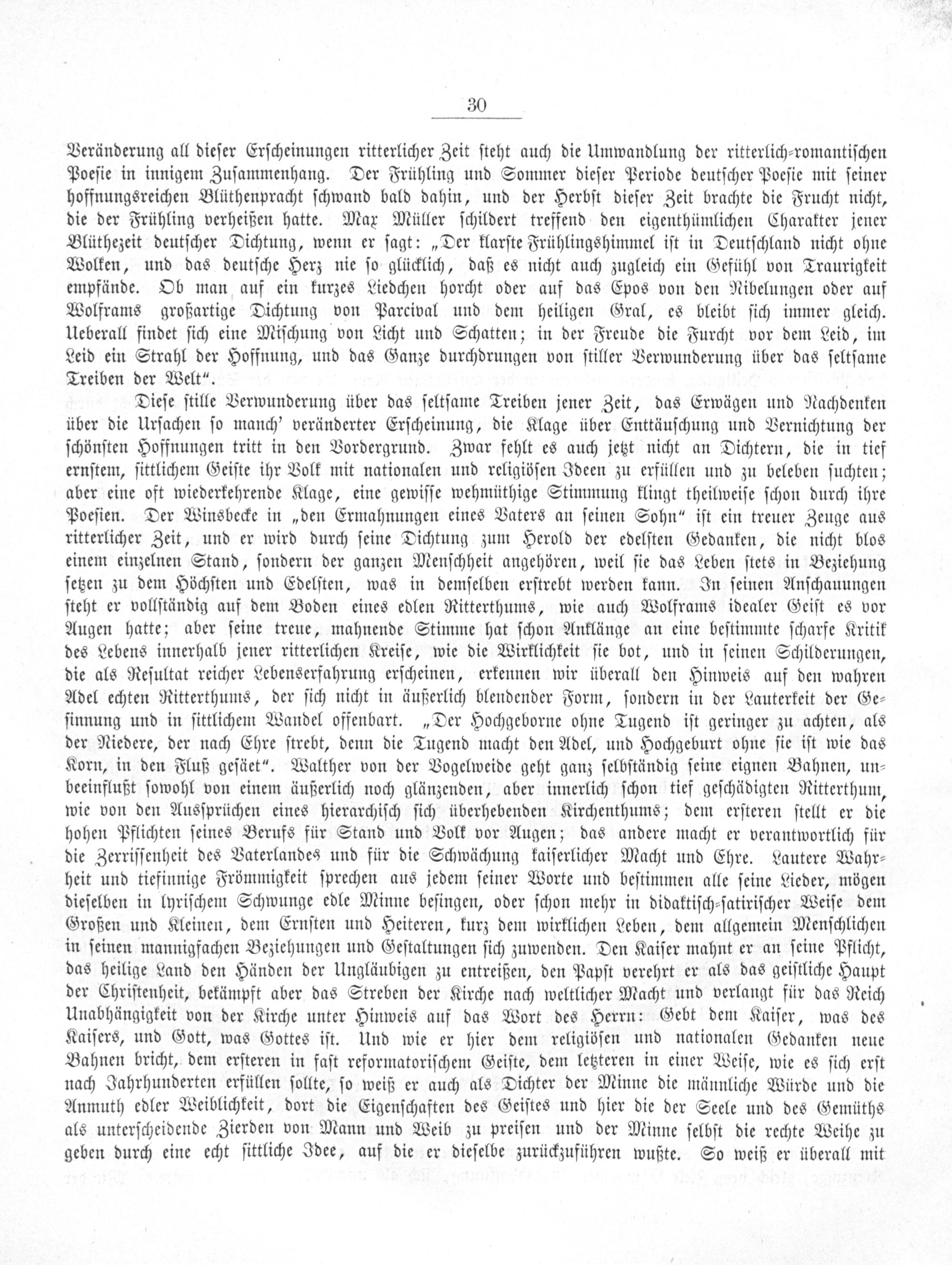 Veränderung all dieſer Erſcheinungen ritterlicher Zeit ſteht auch die Umwandlung der ritterlich⸗romantiſchen Poeſie in innigem Zuſammenhang. Der Frühling und Sommer dieſer Periode deutſcher Poeſie mit ſeiner hoffnungsreichen Blüthenpracht ſchwand bald dahin, und der Herbſt dieſer Zeit brachte die Frucht nicht, die der Frühling verheißen hatte. Max Müller ſchildert treffend den eigenthümlichen Charakter jener Blüthezeit deutſcher Dichtung, wenn er ſagt:„Der klarſte Frühlingshimmel iſt in Deutſchland nicht ohne Wolken, und das deutſche Herz nie ſo glücklich, daß es nicht auch zugleich ein Gefühl von Traurigkeit empfände. Ob man auf ein kurzes Liedchen horcht oder auf das Epos von den Nibelungen oder auf Wolframs großartige Dichtung von Parcival und dem heiligen Gral, es bleibt ſich immer gleich. Ueberall findet ſich eine Miſchung von Licht und Schatten; in der Freude die Furcht vor dem Leid, im Leid ein Strahl der Hoffnung, und das Ganze durchdrungen von ſtiller Verwunderung über das ſeltſame Treiben der Welt“.