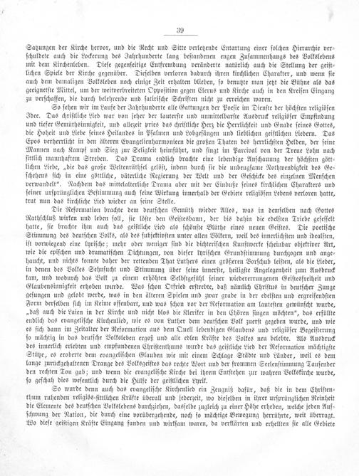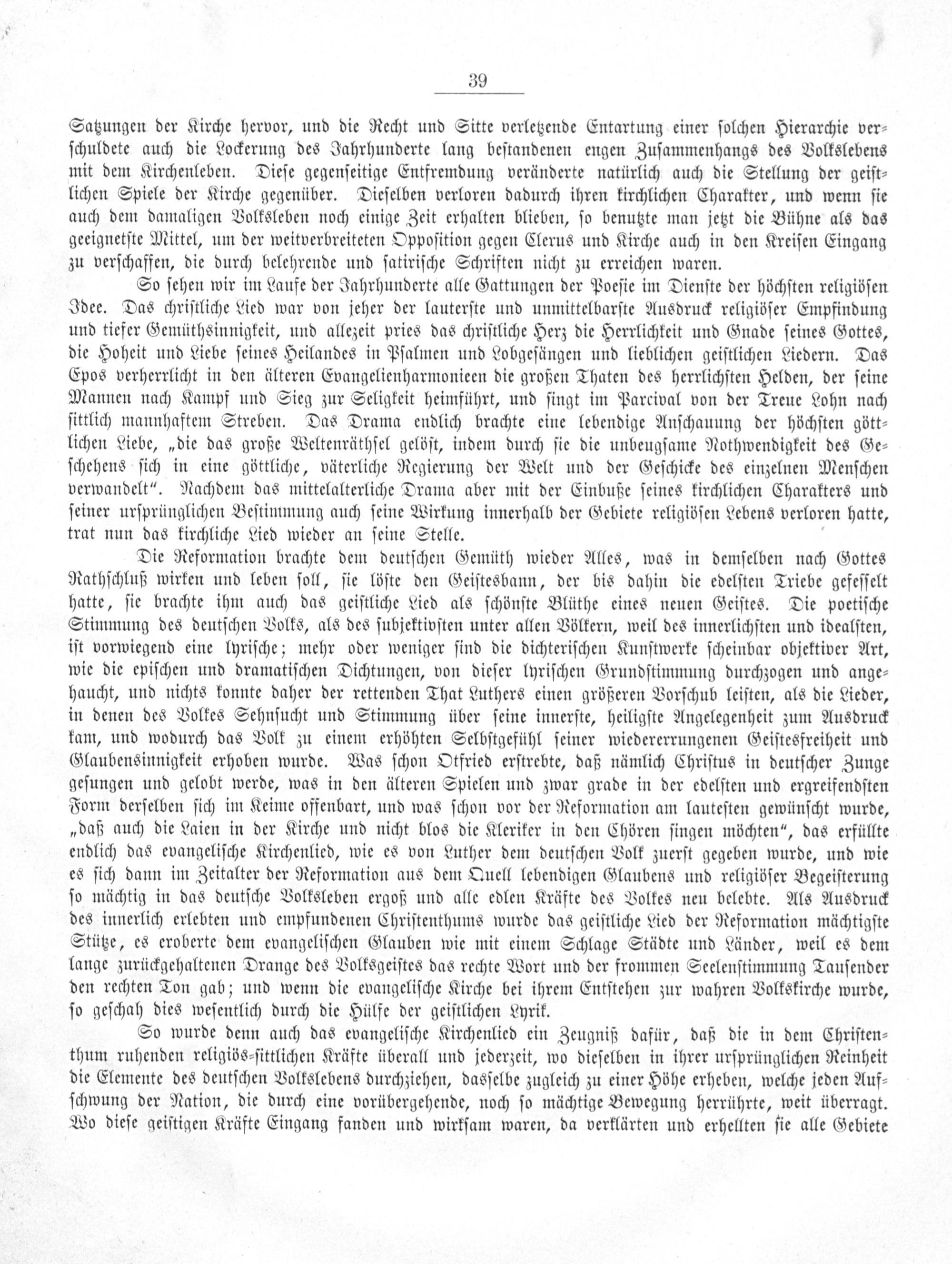 Die Reformation brachte dem deutſchen Gemüth wieder Alles, was in demſelben nach Gottes Rathſchluß wirken und leben ſoll, ſie löſte den Geiſtesbann, der bis dahin die edelſten Triebe gefeſſelt hatte, ſie brachte ihm auch das geiſtliche Lied als ſchönſte Blüthe eines neuen Geiſtes. Die poetiſche Stimmung des deutſchen Volks, als des ſubjektivſten unter allen Völkern, weil des innerlichſten und idealſten, iſt vorwiegend eine lyriſche; mehr oder weniger ſind die dichteriſchen Kunſtwerke ſcheinbar objektiver Art, wie die epiſchen und dramatiſchen Dichtungen, von dieſer lyriſchen Grundſtimmung durchzogen und ange⸗ haucht, und nichts konnte daher der rettenden That Luthers einen größeren Vorſchub leiſten, als die Lieder, in denen des Volkes Sehnſucht und Stimmung über ſeine innerſte, heiligſte Angelegenheit zum Ausdruck kam, und wodurch das Volk zu einem erhöhten Selbſtgefühl ſeiner wiedererrungenen Geiſtesfreiheit und Glaubensinnigkeit erhoben wurde. Was ſchon Otfried erſtrebte, daß nämlich Chriſtus in deutſcher Zunge geſungen und gelobt werde, was in den älteren Spielen und zwar grade in der edelſten und ergreifendſten Form derſelben ſich im Keime offenbart, und was ſchon vor der Reformation am lauteſten gewünſcht wurde, „daß auch die Laien in der Kirche und nicht blos die Kleriker in den Chören ſingen möchten“, das erfüllte endlich das evangeliſche Kirchenlied, wie es von Luther dem deutſchen Volk zuerſt gegeben wurde, und wie es ſich dann im Zeitalter der Reformation aus dem Quell lebendigen Glaubens und religiöſer Begeiſterung ſo mächtig in das deutſche Volksleben ergoß und alle edlen Kräfte des Volkes neu belebte. Als Ausdruck des innerlich erlebten und empfundenen Chriſtenthums wurde das geiſtliche Lied der Reformation mächtigſte Stütze, es eroberte dem evangeliſchen Glauben wie mit einem Schlage Städte und Länder, weil es dem lange zurückgehaltenen Drange des Volksgeiſtes das rechte Wort und der frommen Seelenſtimmung Tauſender den rechten Ton gab; und wenn die evangeliſche Kirche bei ihrem Entſtehen zur wahren Volkskirche wurde, ſo geſchah dies weſentlich durch die Hülfe der geiſtlichen Lyrik.