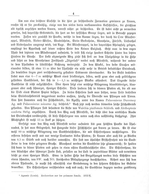 Um nun eine leichtere Einſicht in die hier zu beſchreibende Formation gewinnen zu können, erachte ich es für zweckmäßig, einige von den vielen darin vorkommenden Aufſchlüſſen, die gleichſam als typiſch angeſehen werden können, vorerſt näher zu beſchreiben. Es iſt dabei nicht zu vermeiden geweſen, daß bayeriſche Gebietsteile, die hart an der heſſiſchen Grenze liegen, mit in Betracht gezogen wurden. Faſſen wir zunächſt die Punkte, welche in dem Raume liegen, der durch die Orte Münſter⸗ appel, Mörsfeld, Nieder⸗Wieſen, Wendelsheim, Stein⸗Bockenheim, Wonsheim, Fürfeld, Tiefenthal und Niederhauſen umgrenzt wird, ins Auge. Bei Münſterappel, in der bayeriſchen Rheinpfalz gelegen, empfängt der Appelbach auf ſeiner rechten Seite den kleinen Sulzbach. Geht man in dem engen Thale des letzteren von Münſterappel aufwärts, ſo teilt ſich einige hundert Schritte hinter den letzten Häuſern die Straße. Der links abzweigende Weg zieht ſich ſteil an dem Thalgehänge in die Höhe und führt an dem Wonsheimer Forſthauſe„Jägerluſt“ vorbei nach Mörsfeld, während der andere in dem Thalboden in ſüdöſtlicher Richtung weiterzieht. In dem Winkel, den beide Straßen mit⸗ einander bilden, iſt etwa 15 m über der Thalſohle ein nicht mehr in Betrieb befindlicher Steinbruch. In demſelben liegen zwei verſchiedenartig geſtaltete Sedimente übereinander. An der Baſis desſelben findet man eine 6—7 m mächtige Wand eines feinkörnigen, feſten, meiſt grau oder auch gelblichgrau gefärbten Sandſteines, der ſich in 1—1,5 m mächtigen Bänken abſondert. Das Liegende dieſer Sandſteine iſt nicht aufgeſchloſſen. Über ihnen folgt eine mächtige Ablagerung dünnblätteriger, blau⸗ grauer oder auch ſchwarzer, thoniger Schiefer. Dieſe ſondern ſich in dünnen Platten ab, die oft nur die Dicke eines Blattes Papier beſitzen. In dieſen Schiefern fand man früher, wenn Teile desſelben beim Steinbruchsbetrieb weggeräumt werden mußten, häufig die Überreſte von Pflanzen und Tieren. Von hier ſtammten auch die Fiſchabdrücke, die Agaſſiz unter den Namen Palaeoniscus Duvernoy Ag. und Palaeoniscus minutus Ag. beſchrieb.¹ Auch jetzt noch werden bisweilen ſolche Fiſchabdrücke gefunden. Von Pflanzen ſind beſonders die Reſte von Walchia piniformis Schloth. und Alethopteris conferta Strbg. anzuführen. Durch den Weg nach Mörsfeld, der dicht über dem nördlichen Rande des Steinbruches vorüberzieht, iſt dieſe Schieferzone von unten nach oben vollſtändig bloßgelegt. Ihre Mächtigkeit iſt wohl 15 m ſtark zu ſchätzen.