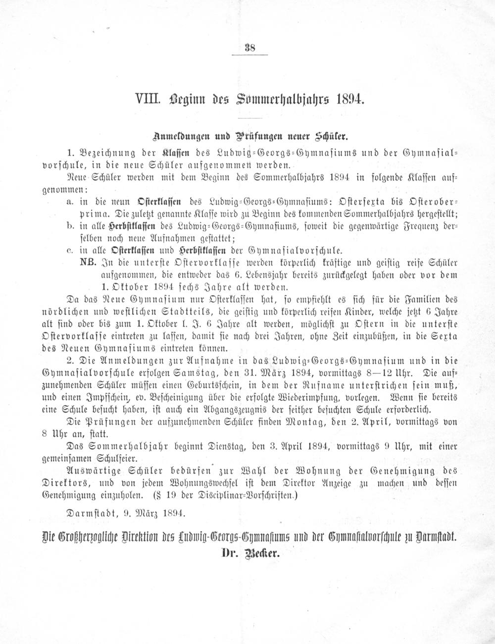 VIII. Beginn des Sommerhalbjahrs 1894.