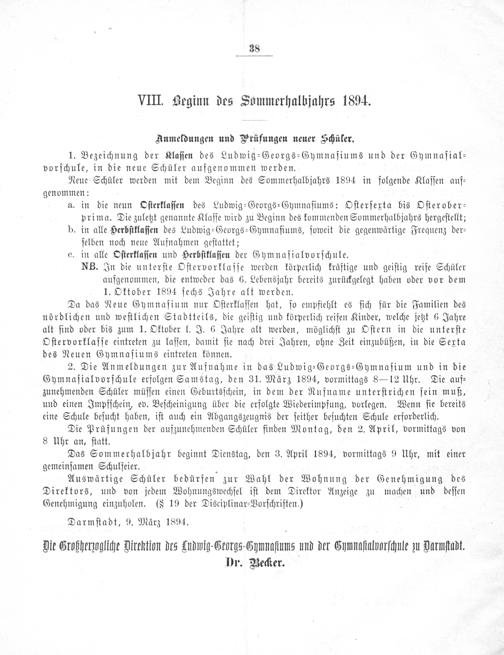 Die Großherogliche Direktion des Tudwig-Georgs-Gymnaſiums und der Gymnaſialvorſchule zu Darmſtadt. Dr. Becker.