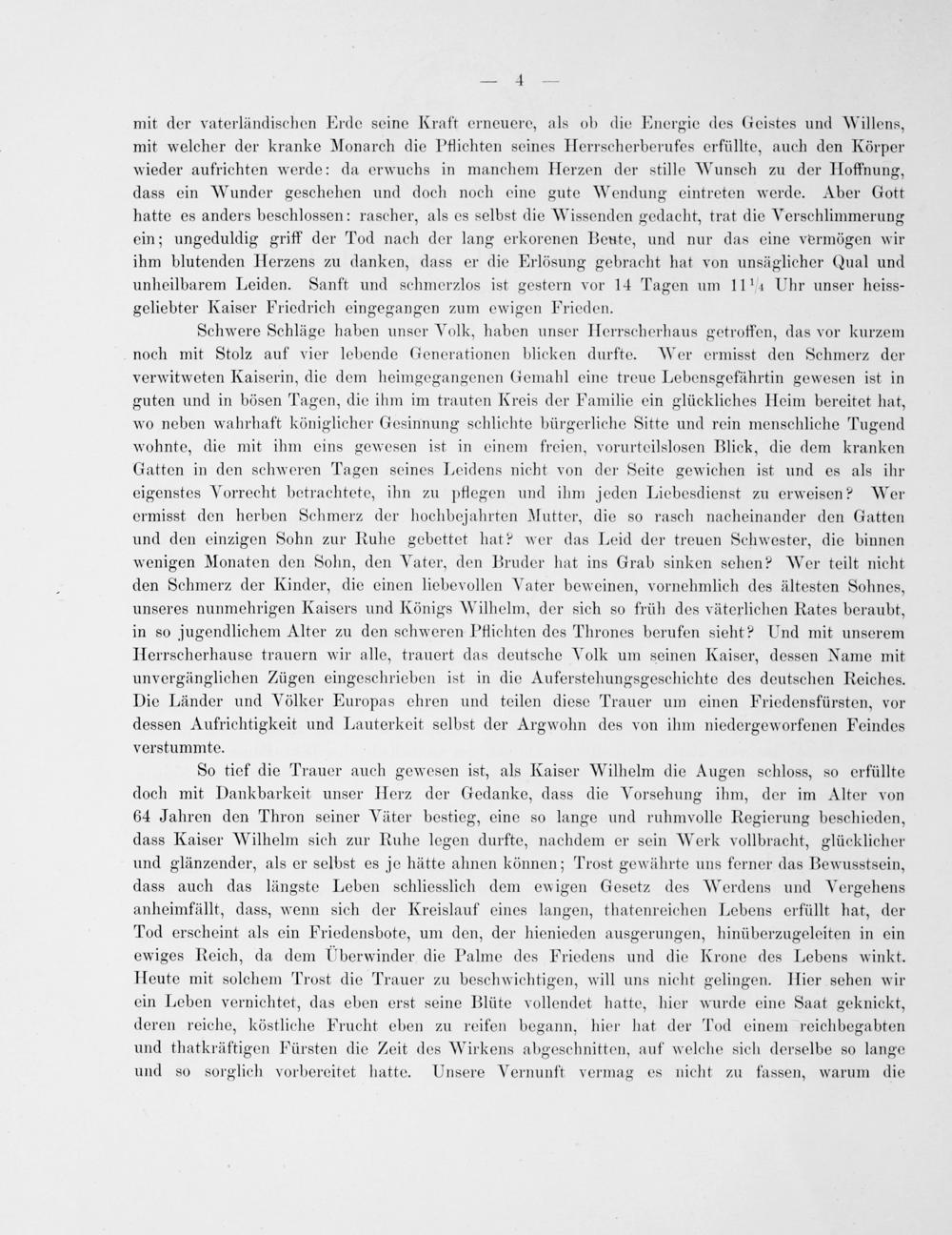 Schwere Schläge haben unser Volk, haben unser Herrscherhaus getroffen, das vor kurzem noch mit Stolz auf vier lebende Generationen blicken durfte. Wer ermisst den Schmerz der verwitweten Kaiserin, die dem heimgegangenen Gemahl eine treue Lebensgefährtin gewesen ist in guten und in bösen Tagen, die ihm im trauten Kreis der Familie ein glückliches Heim bereitet hat, wo neben wahrhaft königlicher Gesinnung schlichte bürgerliche Sitte und rein menschliche Tugend wohnte, die mit ihm eins gewesen ist in einem freien, vorurteilslosen Blick, die dem kranken Gatten in den schweren Tagen seines Leidens nicht von der Seite gewichen ist und es als ihr eigenstes Vorrecht betrachtete, ihn zu pflegen und ihm jeden Liebesdienst zu erweisen? Wer ermisst den herben Schmerz der hochbejahrten Mutter, die so rasch nacheinander den Gatten und den einzigen Sohn zur Ruhe gebettet hat? wer das Leid der treuen Schwester, die binnen wenigen Monaten den Sohn, den Vater, den Bruder hat ins Grab sinken sehen? Wer teilt nicht den Schmerz der Kinder, die einen liebevollen Vater beweinen, vornehmlich des ältesten Sohnes, unseres nunmehrigen Kaisers und Königs Wilhelm, der sich so früh des väterlichen Rates beraubt, in so jugendlichem Alter zu den schweren Pflichten des Thrones berufen sieht? Und mit unserem Herrscherhause trauern wir alle, trauert das deutsche Volk um seinen Kaiser, dessen Name mit unvergänglichen Zügen eingeschrieben ist in die Auferstehungsgeschichte des deutschen Reiches. Die Länder und Völker Europas chren und teilen diese Trauer um einen Friedensfürsten, vor dessen Aufrichtigkeit und Lauterkeit selbst der Argwohn des von ihm niedergeworfenen Feindes verstummte.
