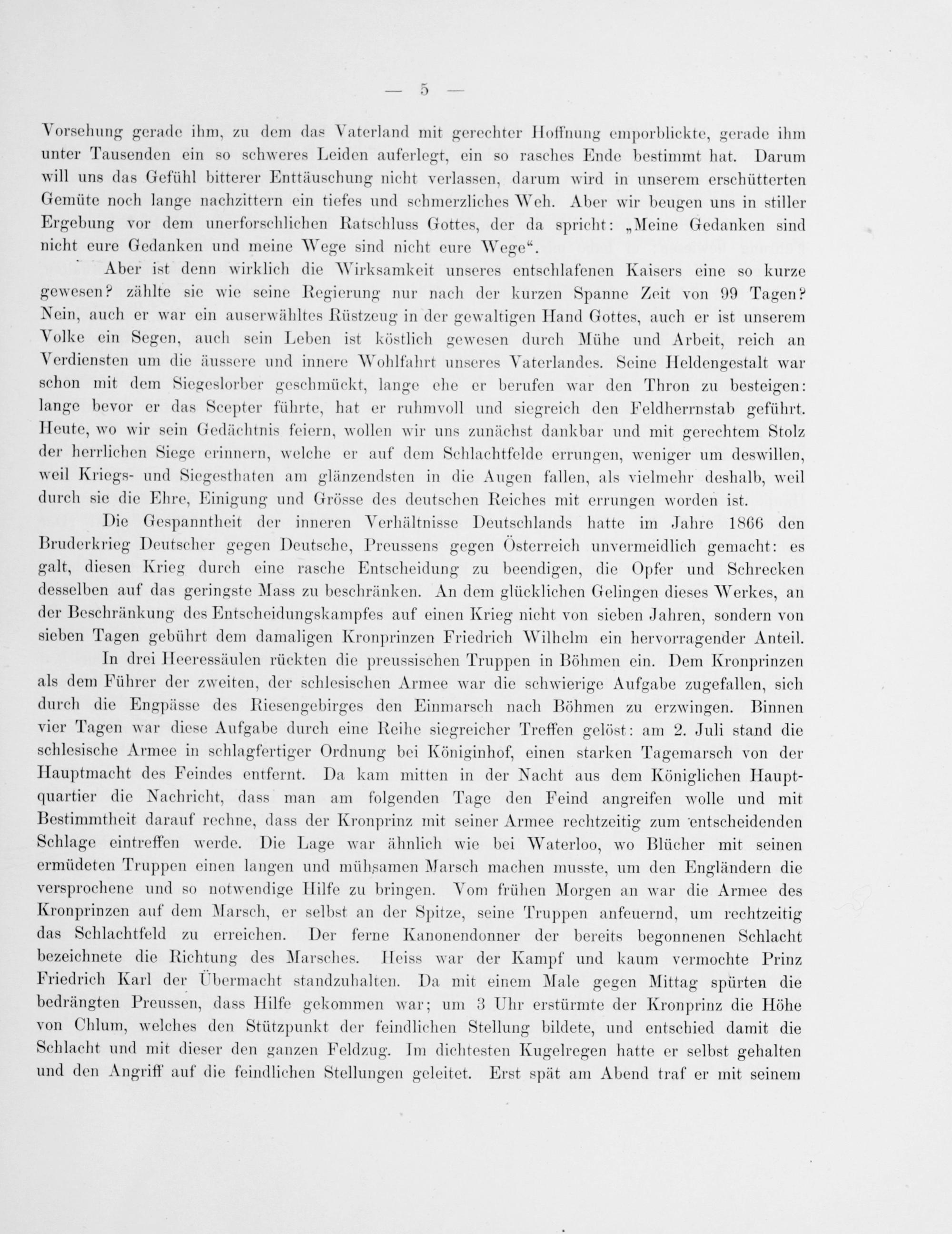 Aber ist denn wirklich die Wirksamkeit unseres entschlafenen Kaisers eine so kurze gewesen? zählte sie wie seine Regierung nur nach der kurzen Spanne Zeit von 99 Tagen? Nein, auch er war ein auserwähltes Rüstzeug in der gewaltigen Hand Gottes, auch er ist unserem Volke ein Segen, auch sein Leben ist köstlich gewesen durch Mühe und Arbeit, reich an Verdiensten um die äussere und innere Wohlfahrt unseres Vaterlandes. Seine Heldengestalt war schon mit dem Siegeslorber geschmückt, lange che er berufen war den Thron zu besteigen: lange bevor er das Scepter führte, hat er ruhmvoll und siegreich den Feldherrnstab geführt. Heute, wo wir sein Gedächtnis feiern, wollen wir uns zunächst dankbar und mit gerechtem Stols der herrlichen Siege crinnern, welche er auf dem Schlachtfelde errungen, weniger um deswillen, weil Kriegs- und Siegesthaten am glänzendsten in die Augen fallen, als vielmehr deshalb, weil durch sie die Ehre, Einigung und Grösse des deutschen Reiches mit errungen worden ist.