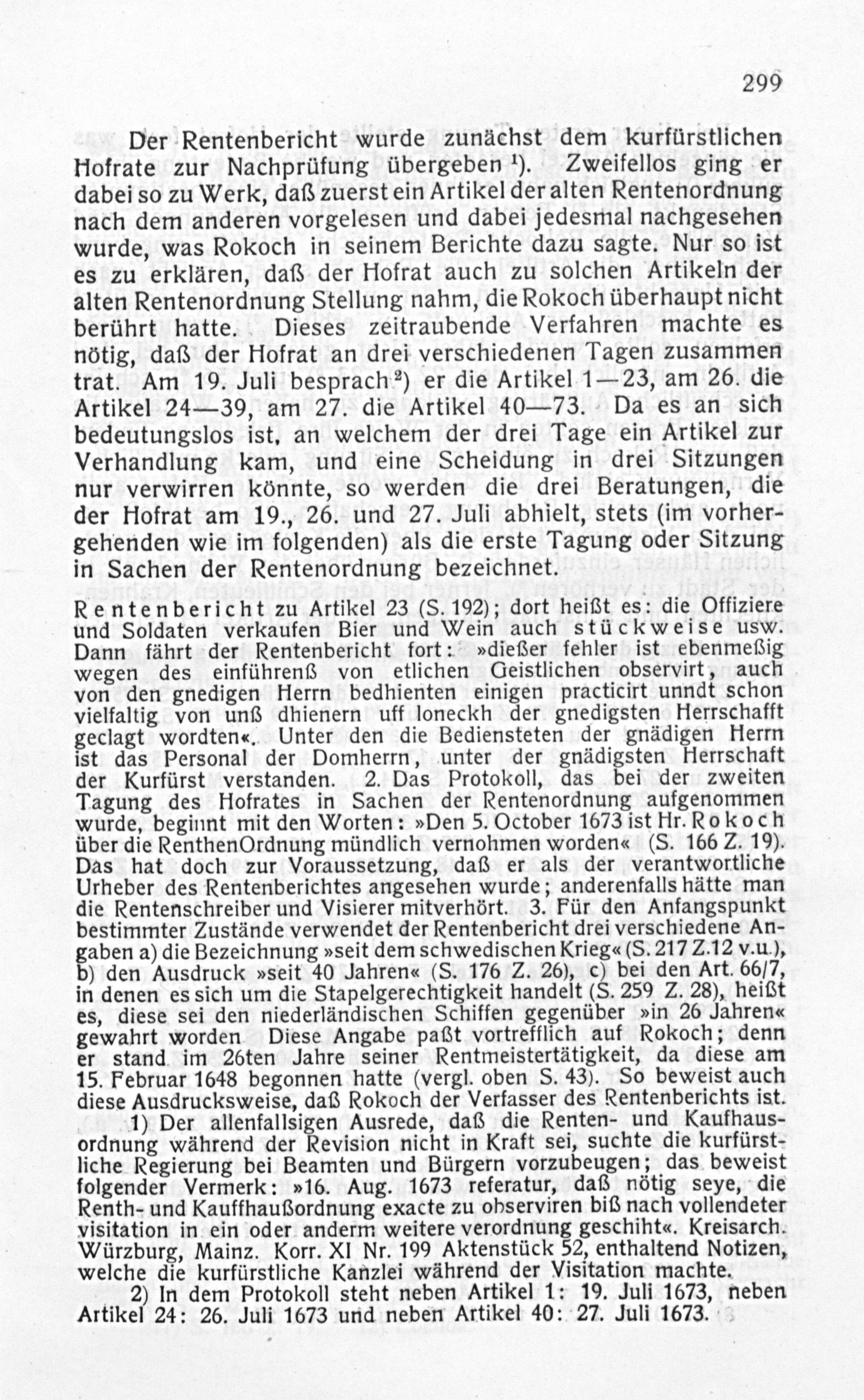Rentenbericht zu Artikel 23(S. 192); dort heißt es: die Offiziere und Soldaten verkaufen Bier und Wein auch stückweise usw. Dann fährt der Rentenbericht fort:»dießer fehler ist ebenmeßig wegen des einführenß von etlichen Geistlichen observirt, auch von den gnedigen Herrn bedhienten einigen practicirt unndt schon vielfaltig von unß dhienern uff loneckh der gnedigsten Herrschafft geclagt wordten«. Unter den die Bediensteten der gnädigen Herrn ist das Personal der Domherrn, unter der gnädigsten Herrschaft der Kurfürst verstanden. 2. Das Protokoll, das bei der zweiten Tagung des Hofrates in Sachen der Rentenordnung aufgenommen wurde, beginnt mit den Worten:»Den 5. October 1673 ist Hr. Rokoch über die RenthenOrdnung mündlich vernohmen worden«(S. 166 Z. 19). Das hat doch zur Voraussetzung, daß er als der verantwortliche Urheber des Rentenberichtes angesehen wurde; anderenfalls nätte man die Rentenschreiber und Visierer mitverhört. 3. Für den Anfangspunkt bestimmter Zustände verwendet der Rentenbericht drei verschiedene An- gaben a) die Bezeichnung»seit dem schwedischen Krieg«(S. 217 Z.12 v. u.), b) den Ausdruck»seit 40 Jahren«(S. 176 Z. 26), c) bei den Art. 66/7, in denen es sich um die Stapelgerechtigkeit handelt(S. 259 Z. 28), heißt es, diese sei den niederländischen Schiffen gegenüber»in 26 Jahren« gewahrt worden Diese Angabe paßt vortrefflich auf Rokoch; denn er stand im 26ten Jahre seiner Rentmeistertätigkeit, da diese am 15. Februar 1648 begonnen hatte(vergl. oben S. 43). So beweist auch diese Ausdrucksweise, daß Rokoch der Verfasser des Rentenberichts ist. 1) Der allenfallsigen Ausrede, daß die Renten- und Kaufhaus- ordnung während der Revision nicht in Kraft sei, suchte die kurfürst- liche Regierung bei Beamten und Bürgern vorzubeugen; das beweist folgender Vermerk:»l6. Aug. 1673 referatur, daß nötig seye, die Renth- und Kauffhaußordnung exacte zu observiren biß nach vollendeter visitation in ein oder anderm weitere verordnung geschiht«. Kreisarch. Würzburg, Mainz. Korr. XI Nr. 190 Aktenstück 52, enthaltend Notizen, welche die kurfürstliche Kanzlei während der Visitation machte. „2) In dem Protokoll steht neben Artikel 1: 19. Juli 1673, neben Artikel 24: 26. Juli 1673 und neben Artikel 40: 27. Juli 1673.