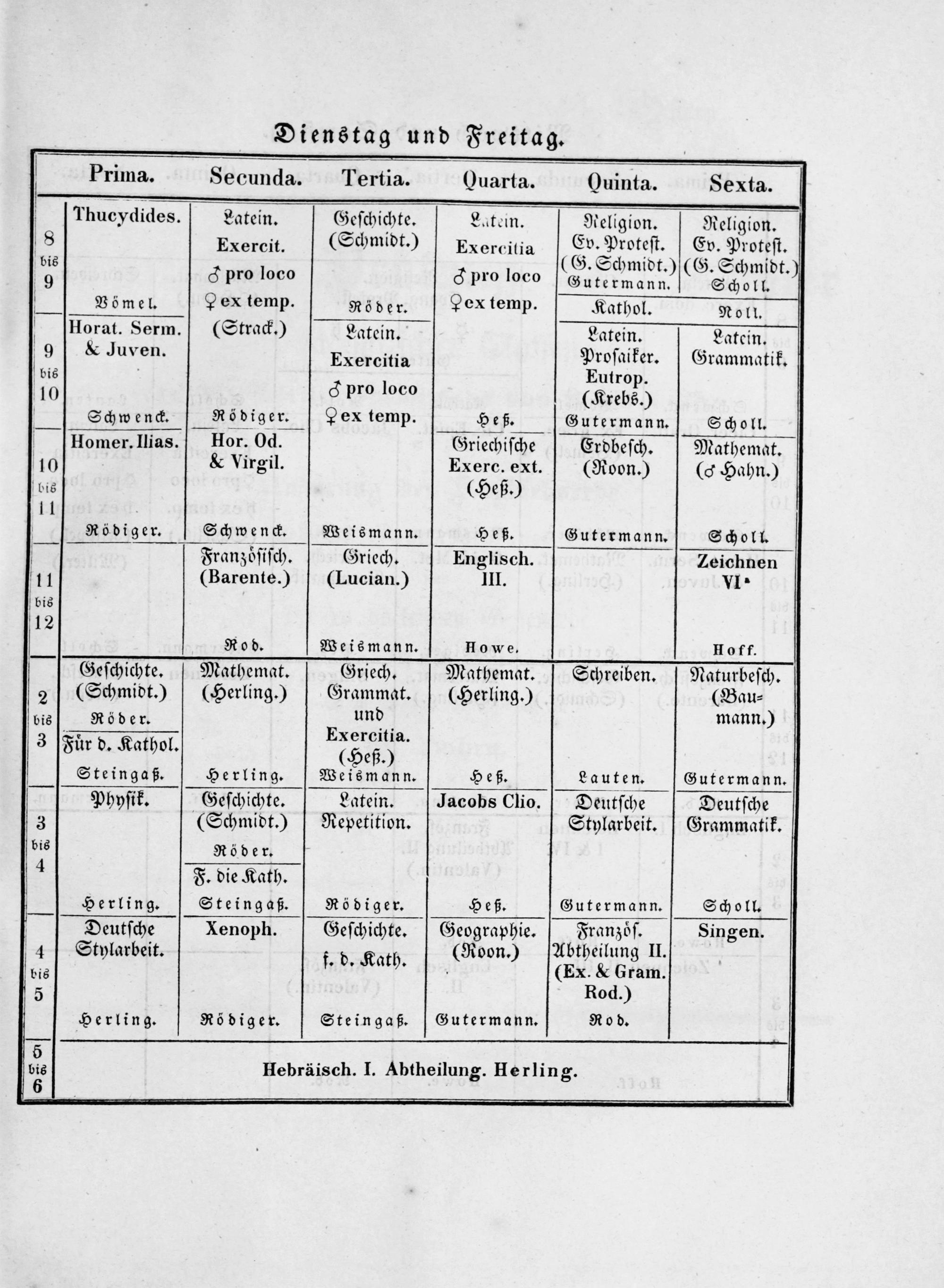 Rod. Weismann. Howe. Hoff. Geſchichte. Mathemat. Griech. Mathemat. Schreiben. Naturbeſch. 2(Schmidt.)(Gerling.) Grammat.(Herling.)(Bau⸗ bis Röder. und mann.) —— Exercitia. 3 Fuͤr d. Kathol. Fuͤr d. Katho(Heß.) Steingaß. Herling. Weismann. Heß. Lauten. Gutermann. Phyſik. Geſchichte. Latein. Jacobs Clio. Deutſche Deutſche