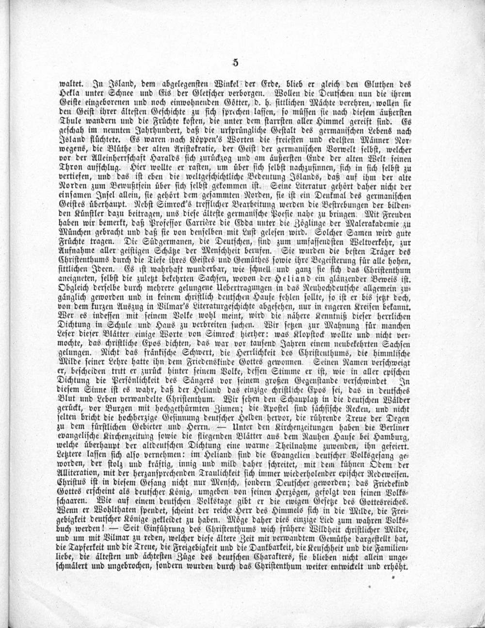 waltet. In Island, dem abgelegenſten Winkel der Erde, blieb er gleich den Gluthen des Hekla unter Schnee und Eis der Gletſcher verborgen. Wollen die Deutſchen nun die ihrem Geiſte eingeborenen und noch einwohnenden Götter, d. h. ſittlichen Mächte verehren, wollen ſie den Geiſt ihrer älteſten Geſchichte zu ſich ſprechen laſſen, ſo müſſen ſie nach dieſem äußerſten Thule wandern und die Früchte koſten, die unter dem ſtarrſten aller Himmel gereift ſind. Es geſchah im neunten Jahrhundert, daß die urſprüngliche Geſtalt des germaniſchen Lebens nach Island flüchtete. Es waren nach Köppen's Worten die freieſten und edelſten Männer Nor⸗ wegens, die Blüthe der alten Ariſtokratie, der Geiſt der germaniſchen Vorwelt ſelbſt, welcher vor der Alleinherrſchaft Haralds ſich zurückzog und am äußerſten Ende der alten Welt ſeinen Thron aufſchlug. Hier wollte er raſten, um über ſich ſelbſt nachzuſinnen, ſich in ſich ſelbſt zu vertiefen, und das iſt eben die weltgeſchichtliche Bedeutung Islands, daß auf ihm der alte Norden zum Bewußtſein über ſich ſelbſt gekommen iſt. Seine Literatur gehört daher nicht der einſamen Inſel allein, ſie gehört dem geſammten Norden, ſie iſt ein Denkmal des germaniſchen Geiſtes überhaupt. Nebſt Simrock's trefflicher Bearbeitung werden die Beſtrebungen der bilden⸗ den Künſtler dazu beitragen, uns dieſe älteſte germaniſche Poeſie nahe zu bringen. Mit Freuden haben wir bemerkt, daß Profeſſor Carrière die Edda unter die Zöglinge der Malerakademie zu München gebracht und daß ſie von denſelben mit Luſt geleſen wird. Solcher Samen wird gute Fruͤchte tragen. Die Südgermanen, die Deutſchen, ſind zum umfaſſendſten Weltverkehr, zur Aufnahme aller geiſtigen Schätze der Menſchheit berufen. Sie wurden die beſten Träger des Chriſtenthums durch die Tiefe ihres Geiſtes und Gemüthes ſowie ihre Begeiſterung für alle hohen, ſittlichen Ideen. Es iſt wahrhaft wunderbar, wie ſchnell und ganz ſie ſich das Chriſtenthum aneigneten, ſelbſt die zuletzt bekehrten Sachſen, wovon der Heliand ein glänzender Beweis iſt. Obgleich derſelbe durch mehrere gelungene Uebertragungen in das Neuhochdeutſche allgemein zu⸗ gänglich geworden und in keinem chriſtlich deutſchen Hauſe fehlen ſollte, ſo iſt er bis jetzt doch, von dem kurzen Auszug in Vilmar's Literaturgeſchichte abgeſehen, nur in engeren Kreiſen bekannt. Wer es indeſſen mit ſeinem Volke wohl meint, wird die nähere Kenntniß dieſer herrlichen Dichtung in Schule und Haus zu verbreiten ſuchen. Wir ſetzen zur Mahnung für manchen Leſer dieſer Blätter einige Worte von Simrock hierher: was Klopſtock wollte und nicht ver⸗ mochte, das chriſtliche Epos dichten, das war vor tauſend Jahren einem neubekehrten Sachſen gelungen. Nicht das fränkiſche Schwert, die Herrlichkeit des Chriſtenthums, die himmliſche Milde ſeiner Lehre hatte ihn dem Friedenskinde Gottes gewonnen. Seinen Namen verſchweigt er, beſcheiden tritt er zurück hinter ſeinem Volke, deſſen Stimme er iſt, wie in aller epiſchen Dichtung die Perſönlichkeit des Sängers vor ſeinem großen Gegenſtande verſchwindet. In dieſem Sinne iſt es wahr, daß der Heliand das einzige chriſtliche Epos ſei, das in deutſches Blut und Leben verwandelte Chriſtenthum. Wir ſehen den Schauplatz in die deutſchen Waͤlder gerückt, vor Burgen mit hochgethürmten Zinnen; die Apoſtel ſind ſächſiſche Recken, und nicht ſelten bricht die hochherzige Geſinnung deutſcher Helden hervor, die rührende Treue der Degen zu dem fürſtlichen Gebieter und Herrn.— Unter den Kirchenzeitungen haben die Berliner evangeliſche Kirchenzeitung ſowie die fliegenden Blätter aus dem Rauhen Hauſe bei Hamburg, welche überhaupt der altdeutſchen Dichtung eine warme Theilnahme zuwenden, ihn gefeiert. Letztere laſſen ſich alſo vernehmen: im Heliand ſind die Evangelien deutſcher Volksgeſang ge⸗ worden, der ſtolz und kräftig, innig und mild daher ſchreitet, mit dem kühnen Odem der Alliteration, mit der herzanſprechenden Traulichkeit ſich immer wiederholender epiſcher Redeweiſen. Chriſtus iſt in dieſem Geſang nicht nur Menſch, ſondern Deutſcher geworden; das Friedekind Gottes erſcheint als deutſcher König, umgeben von ſeinen Herzögen, gefolgt von ſeinen Volks⸗ ſchaaren. Wie auf einem deutſchen Volkstage gibt er die ewigen Geſetze des Gottesreiches. Wenn er Wohlthaten ſpendet, ſcheint der reiche Herr des Himmels ſich in die Milde, die Frei⸗ gebigkeit deutſcher Könige gekleidet zu haben. Möge daher dies einzige Lied zum wahren Volks⸗ buch werden!— Seit Einführung des Chriſtenthums wich frühere Wildheit chriſtlicher Milde, und um mit Vilmar zu reden, welcher dieſe ältere Zeit mit verwandtem Gemüthe dargeſtellt hat, die Tapferkeit und die Treue, die Freigebigkeit und die Dankbarkeit, die Keuſchheit und die Familien⸗ liebe, die älteſten und ächteſten Züge des deutſchen Charakters, ſie blieben nicht allein unge⸗ ſchmälert und ungebrochen, ſondern wurden durch das Chriſtenthum weiter entwickelt und erhöht.