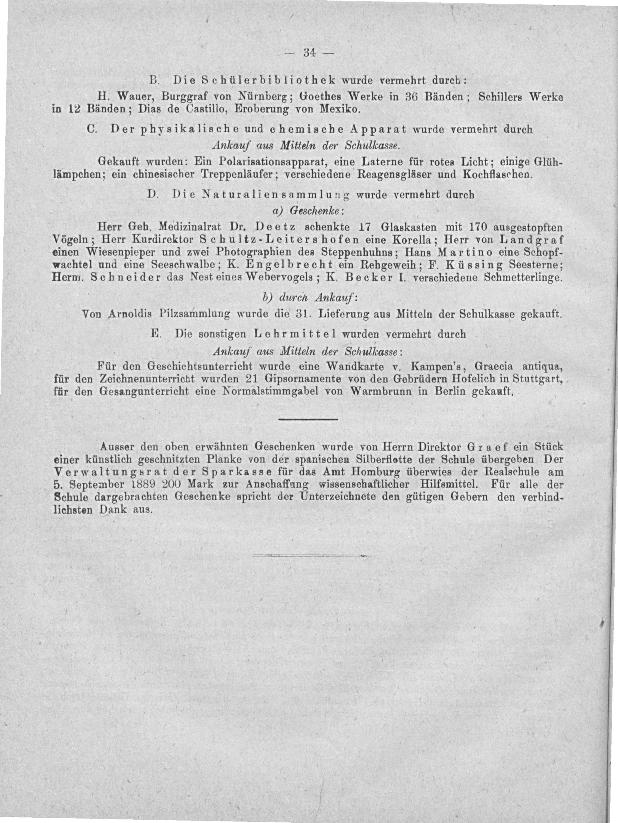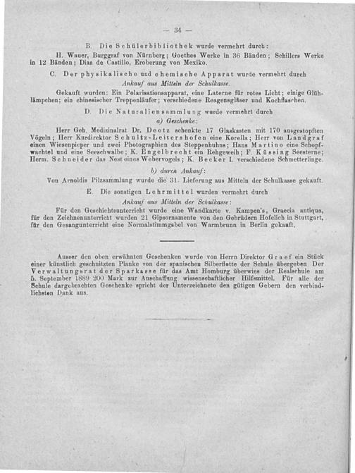 Ausser den oben erwähnten Geschenken wurde von Herrn Direktor Graef ein Stück einer künstlich geschnitzten Planke von der spanischen Silberflotte der Schule übergeben Der Verwaltungsrat der Sparkasse für das Amt Homburg überwies der Realschule am 5. September 1889 200 Mark zur Anschaffung wissenschaftlicher Hilfsmittel. Für alle der Schule dargebrachten Geschenke spricht der Unterzeichnete den gütigen Gebern den verbind- lichsten Dank aus.