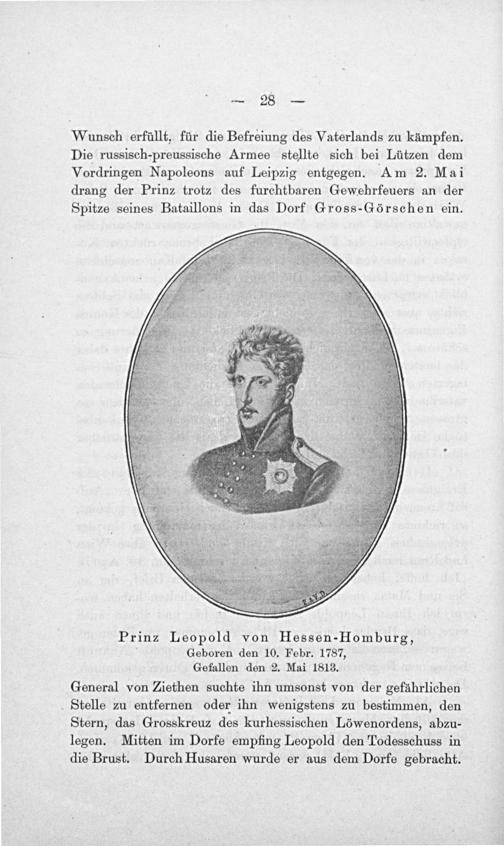 Wunsch erfüllt, für die Befreiung des Vaterlands zu kämpfen. Die russisch-preussische Armee stellte sich bei Lützen dem Vordringen Napoleons auf Leipzig entgegen. Am 2. Mai drang der Prinz trotz des furchtbaren Gewehrfeuers an der Spitze seines Bataillons in das Dorf Gross-Görschen ein.