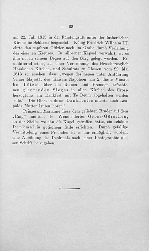 am 22. Juli 1813 in der Fürstengruft unter der lutherischen Kirche im Schlosse beigesetzt. König Friedrich Wilhelm III. ehrte den tapferen Offizier noch im Grabe durch Verleihung des eisernen Kreuzes. In silberner Kapsel verwahrt, ist es ihm neben seinem Degen auf den Sarg gelegt worden. Er- schütternd ist es, aus einer Verordnung des Grossherzoglich Hessischen Kirchen- und Schulrats zu Giessen vom 22. Mai 1813 zu ersehen, dass„wegen des neuen unter Anführung Seiner Majestät des Kaisers Napoleon am 2. dieses Monats bei Lützen über die Russen und Preussen erfochte- nen glänzenden Sieges in allen Kirchen des Gross- herzogtums ein Dankfest mit Te Deum abgehalten werden solle.“ Die Glocken dieses Dankfestes musste auch Leo- polds Mutter läuten hören!