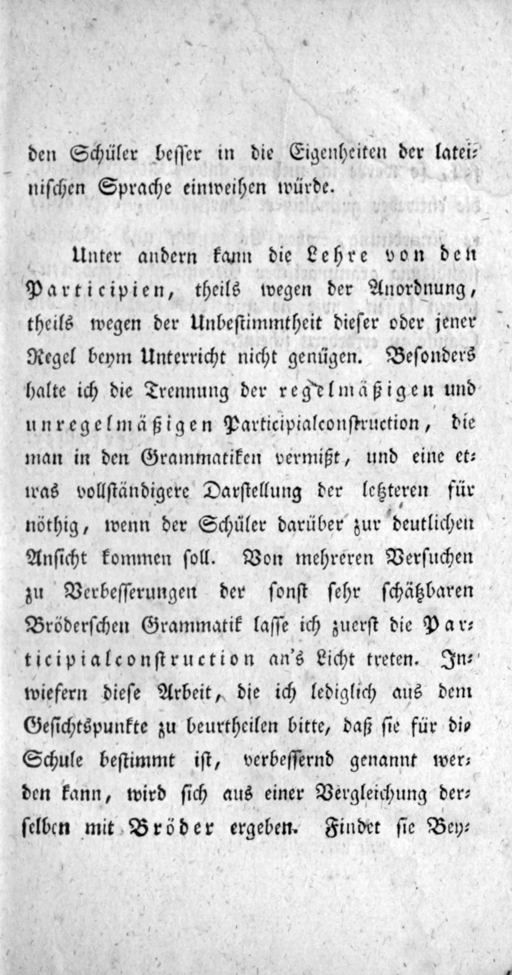 unnter andern kann die Lehre von den Participien, theils wegen der Anordnung, theils wegen der Unbeſtimmtheit dieſer oder jener Regel beym Unterricht nicht genügen. Beſonders halte ich die Trennung der regelmäßigen und unregelmäßigen Participialconſtruction, die man in den Grammatiken vermißt, und eine et⸗ was vollſtändigere Darſtellung der letzteren für nöthig, wenn der Schüler darüber zur deutlichen Anſicht kommen ſoll. Von mehreren Verſuchen zu Verbeſſerungen der ſonſt ſehr ſchätzbaren Bröderſchen Grammatik laſſe ich zuerſt die Par⸗ ticipialconſtruction an's Licht treten. In⸗ wiefern dieſe Arbeit, die ich lediglich aus dem Geſichtspunkte zu beurtheilen bitte, daß ſie für dio Schule beſtimmt iſt, verbeſſernd genannt wer⸗ den kann, wird ſich aus einer Vergleichung der⸗ ſelben mit Bröder ergeben. Findet ſie Bey⸗