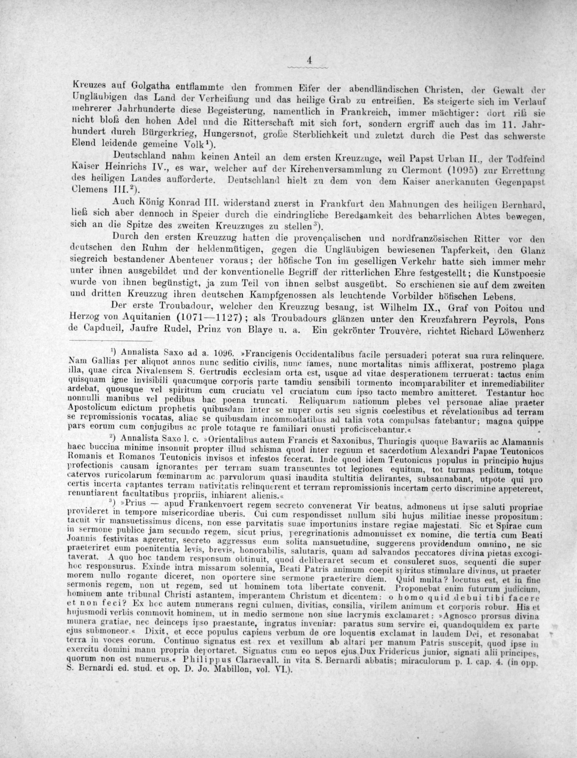 ²) Annalista Saxo J. c.»Orientalibus autem Francis et Saxonibus, Thuringis quoque Bawariis ac Alamannis haec buccina minime insonuit propter illud schisma quod inter regnum et sacerdotium Alexandri Papae Teutonicos Romanis et Romanos Teutonicis invisos et infestos fecerat. Inde quod idem Teutonicus populus in principio hujus profectionis causam ignorantes per terram suam transeuntes tot legiones equitum, tot turmas peditum, totque catervos ruricolarum fœminarum ac parvulorum quasi inaudita stultitia delirantes, subsannabant, utpote qui pro certis incerta captantes terram nativitatis relinqucrent et terram repromissionis incertam certo discrimine appeterent, renuntiarent facultatibus propriis, inhiarent alienis.-