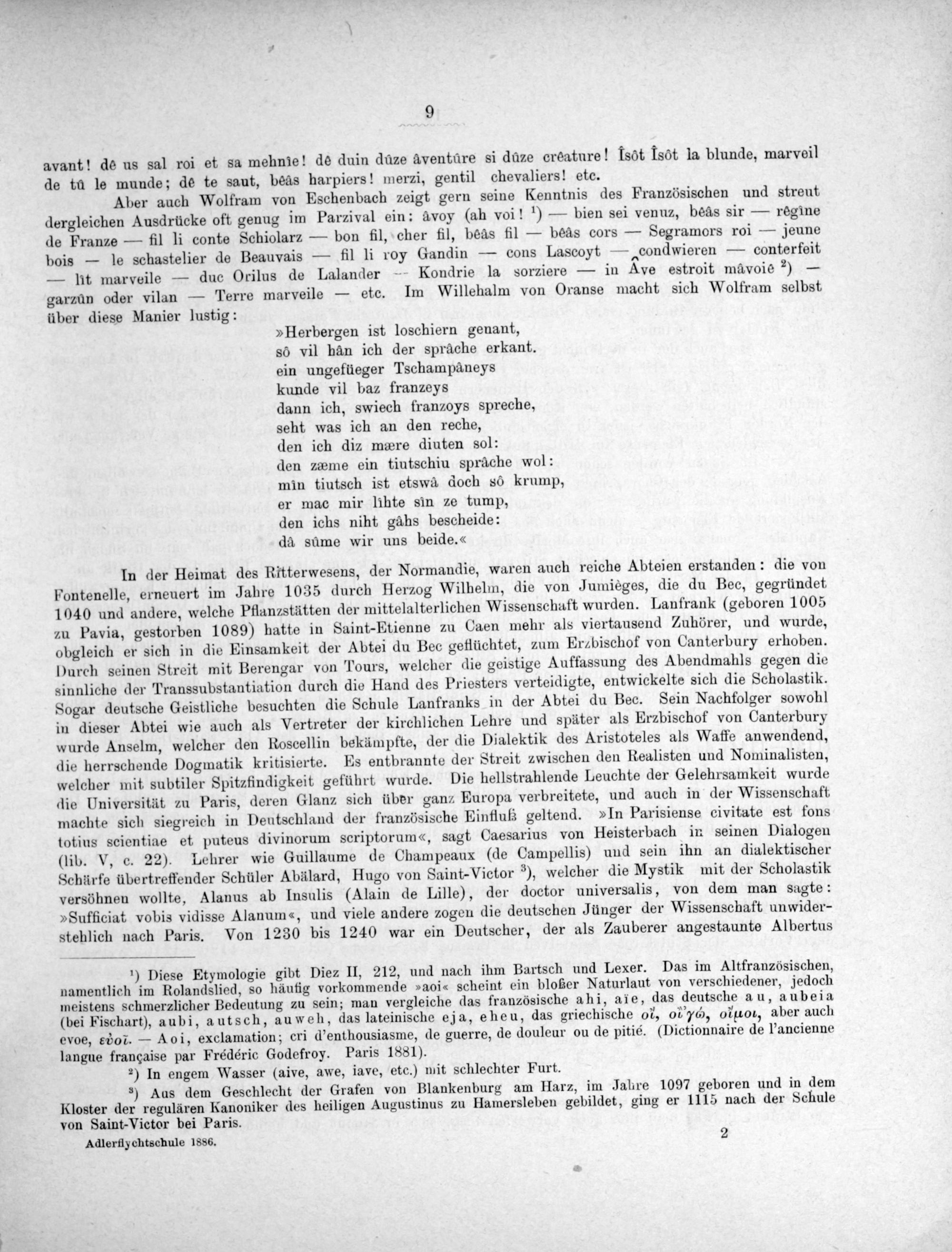 Aber auch Wolfram von Eschenbach zeigt gern seine Kenntnis des Französischen und streut dergleichen Ausdrücke oft genug im Parzival ein: avoy(ah voi! ¹)— bien sei venuz, beâs sir— regine de Franze— fil li conte Schiolarz— bon fll, cher fil, beas fil— beas cors— Segramors roi— jeune