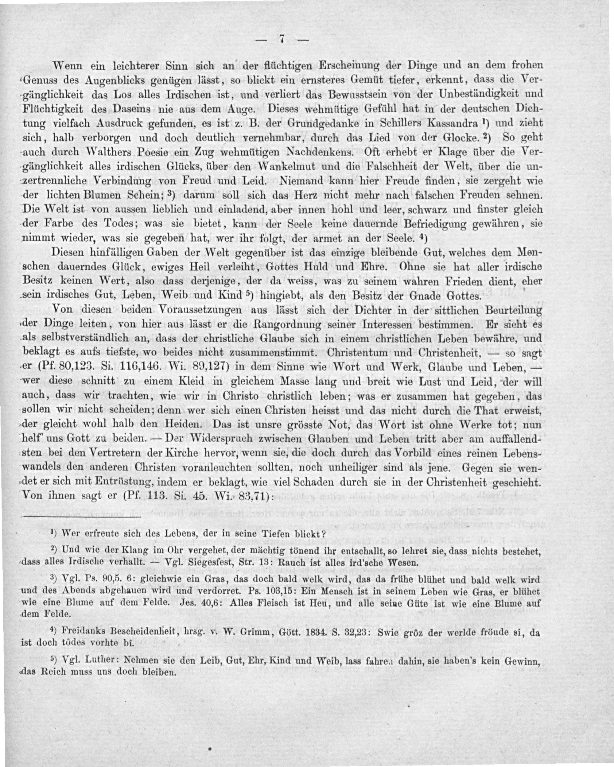 Wenn ein leichterer Sinn sich an der flüchtigen Erscheinung der Dinge und an dem frohen Genuss des Augenblicks genügen lässt, so blickt ein ernsteres Gemüt tiefer, erkennt, dass die Ver- gänglichkeit das Los alles Irdischen ist, und verliert das Bewusstsein von der Unbeständigkeit und Flüchtigkeit des Daseins nie aus dem Auge. Dieses wehmüttige Gefühl hat in der deutschen Dich- tung vielfach Ausdruck gefunden, es ist z. B. der Grundgedanke in Schillers Kassandra ¹) und zieht sich, halb verborgen und doch deutlich vernehmbar, durch das Lied von der Glocke. ²) So geht auch durch Walthers Poesie ein Zug wehmütigen Nachdenkens. Oft erhebt er Klage über die Ver- gänglichkeit alles irdischen Glücks, über den Wankelmut und die Falschheit der Welt, über die un- zertrennliche Verbindung von Freud und Leid. Niemand kann hier Freude finden, sie zergeht wie der lichten Blumen Schein; ³) darum soll sich das Herz nicht mehr nach falschen Freuden sehnen. Die Welt ist von aussen lieblich und einladend, aber innen hohl und leer, schwarz und finster gleich der Farbe des Todes; was sie bietet, kann der Seele keine dauernde Befriedigung gewühren, sie nimmt wieder, was sie gegeben hat, wer ihr folgt, der armet an der Seele. ¹)