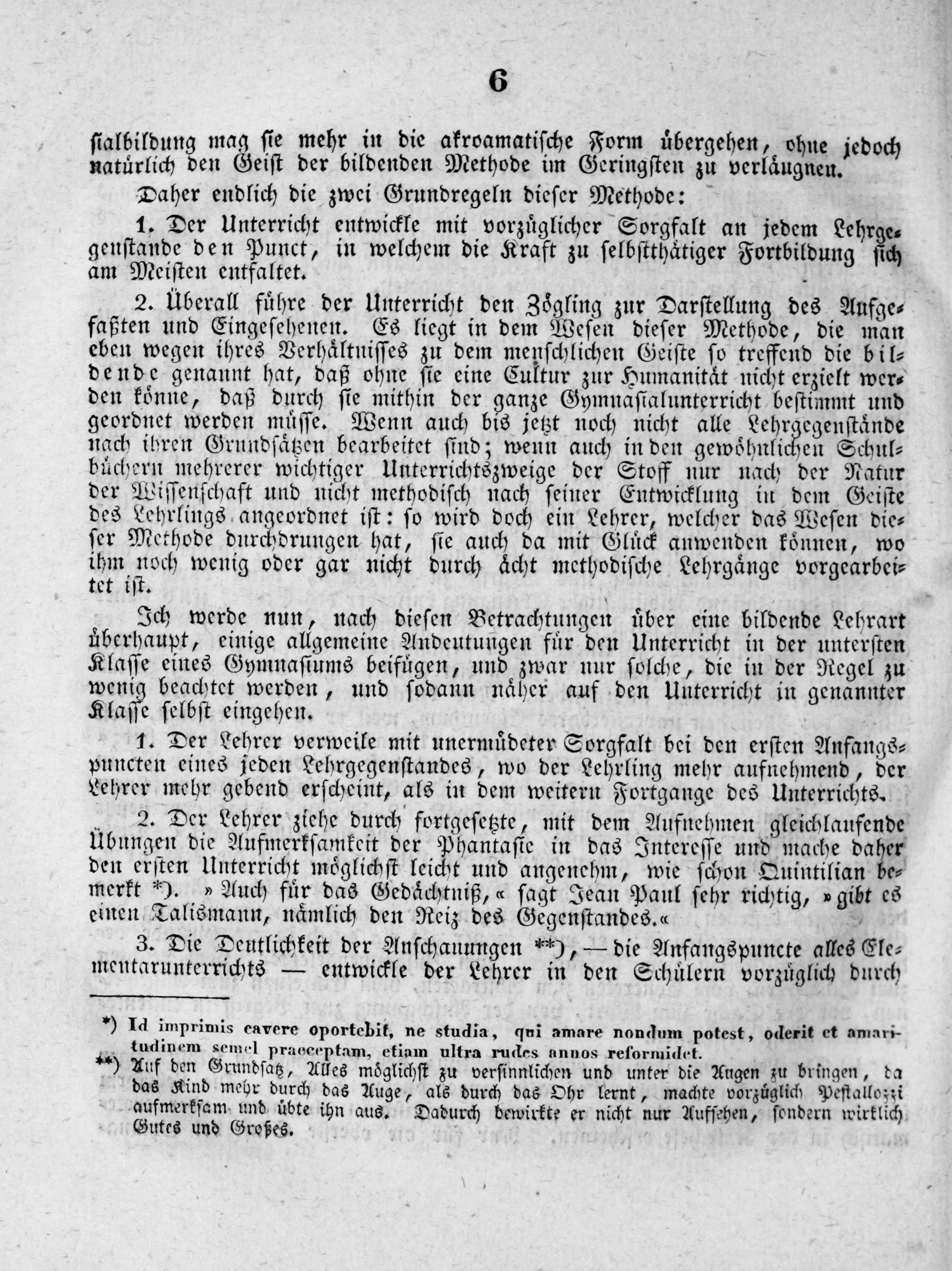 2. Überall fuͤhre der Unterricht den Zoͤgling zur Darſtellung des Aufge⸗ faßten und Eingeſehenen. Es liegt in dem Weſen dieſer Methode, die man eben wegen ihres Verhaͤltniſſes zu dem menſchlichen Geiſte ſo treffend die bil⸗ dende genannt hat, daß ohne ſie eine Cultur zur Humantitaͤt nicht erzielt wer⸗ den koͤnne, daß durch ſie mithin der ganze Gymnaſialunterricht beſtimmt und geordnet werden muͤſſe. Wenn auch bis jetzt noch nicht alle Lehr egenſtaͤnde nach ihren Grundſaͤtzen bearbeitet ſind; wenn auch in den gewoͤhnlichen Schul⸗ buͤchern mehrerer wichtiger Unterrichtszweige der Stoff nur nach der Natur der Wiſſenſchaft und nicht methodiſch nach ſeiner Entwicklung in dem Geiſte des Lehrlings angeordnet iſt: ſo wird doch ein Lehrer, welcher das Weſen die⸗ ſer Methode durchdrungen hat, ſie auch da mit Gluͤck anwenden koͤnnen, wo ihm füoch wenig oder gar nicht durch aͤcht methodiſche Lehrgaͤnge vorgearbei⸗ tet iſt..