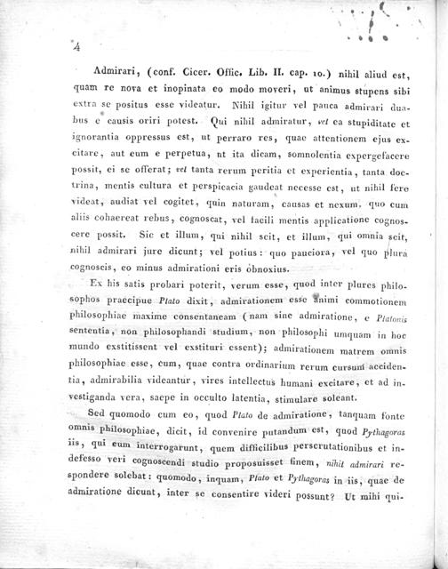 Ex his satis probari poterit, verum esse, quod inter plures philo- sophos praecipue Plato dixit, admirationem esse dAnimi commotionem Philosophiae maxime consentaneam(nam sine admiratione, e Platonis sententia, non philosophandi studium, non philosophi umquam in hoc mundo exstitissent vel exstituri essent); admirationem matrem omnis philosophiae esse, cum, quae contra ordinarium rerum cursuni acciden- tia, admirabilia videantur, vires intellectus humani excitare, et ad in- vestiganda vera, saepe in occulto latentia, stimulare soleant.