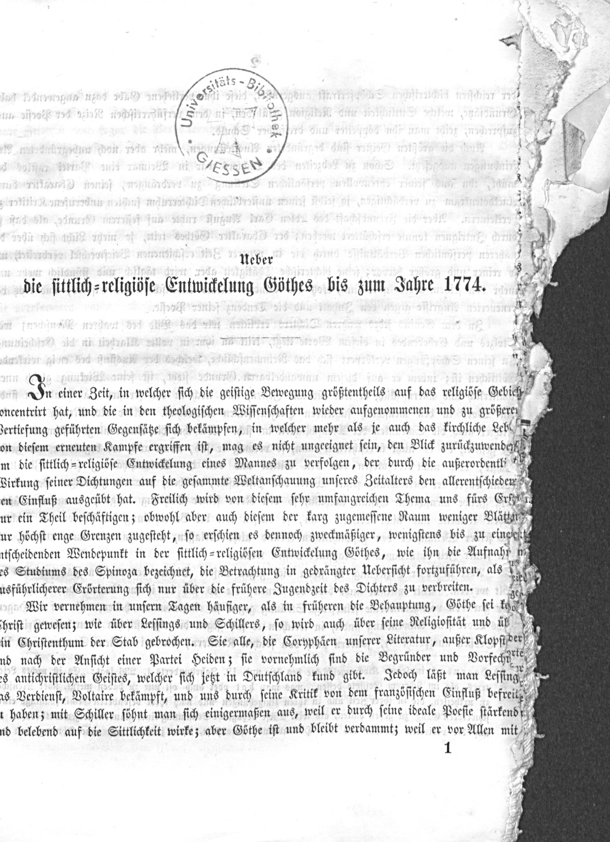 Wir vernehmen in unſern Tagen häufiger, als in früheren die Behauptung, Göthe ſei koce hhriſt geweſen; wie über Leſſings und Schillers, ſo wird auch über ſeine Religioſität und il in Chriſtenthum der Stab gebrochen. Sie alle, die Coryphäen unſerer Literatur, außer Klopſider nd nach der Anſicht einer Partei Heiden; ſie vornehmlich ſind die Begründer und Vorfechie s antichriſtlichen Geiſtes, welcher ſich jett in Deutſchland kund gibt. Jedoch läßt man Leſſinge as Verdienſt, Voltaire bekämpft, und uns durch ſeine Kritik von dem franzöſiſchen Einfluß befreit haben; mit Schiller ſöhnt man ſich einigermaßen aus, weil er durch ſeine ideale Poeſie ſtärkend ri nd belebend auf die Sittlichkeit wirke; aber Göthe iſt und bleibt verdammt; weil er vor Allen mit/ ½