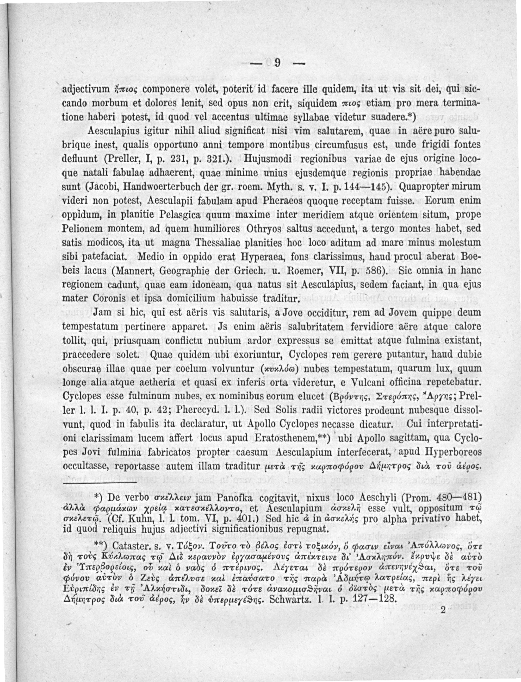 Jam si hic, qui est aëris vis salutaris, a Jove occiditur, rem ad Jovem quippe deum tempestatum pertinere apparet. Js enim aöris salubritatem fervidiore aëre atque calore tollit, qui, priusquam conflictu nubium ardor expressus se emittat atque fulmina existant, praecedere solet. Quae quidem ubi exoriuntur, Cyclopes rem gerere putantur, haud dubie obscurae illae quae per coelum volvuntur(ævxlο) nubes tempestatum, quarum lux, quum longe alia atque aetheria et quasi ex inferis orta videretur, e Vulcani officina repetebatur. Cyclopes esse fulminum nubes, ex nominibus eorum elucet(B96urns, Tregdæns, Apyns; Prel- ler l. I. I. p. 40, p. 42; Pherecyd. 1. l.). Sed Solis radii victores prodeunt nubesque dissol- vunt, quod in fabulis ita declaratur, ut Apollo Cyclopes necasse dicatur. Cui interpretati- oni clarissimam lucem affert locus apud Eratosthenem,**) ubi Apollo sagittam, qua Cyclo- pes Jovi fulmina fabricatos propter caesum Aesculapium interfecerat, apud Hyperboreos occultasse, reportasse autem illam traditur gerd νπ εαάραοσ⁵sνενιεεο d ouν dεοos.