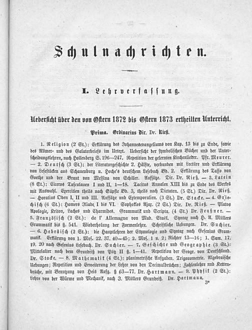 Ueberſicht über den von Oſtern 1872 bis Oſtern 1873 ertheilten Unterricht. Prima. Ordinarins Dir. Dr. Rieß.