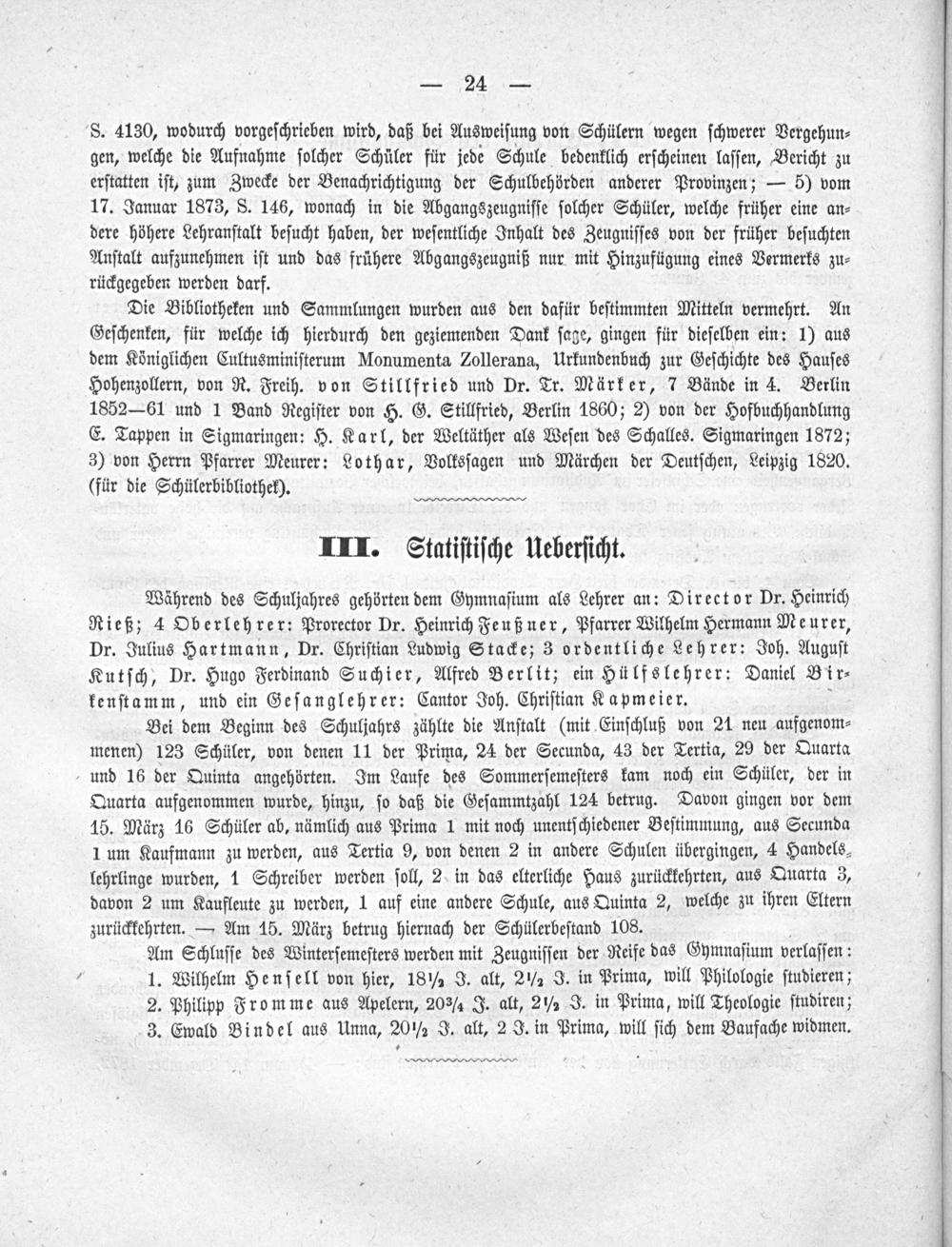 Die Bibliotheken und Sammlungen wurden aus den dafür beſtimmten Mitteln vermehrt. An Geſchenken, für welche ich hierdurch den geziemenden Dank ſage, gingen für dieſelben ein: 1) aus dem Königlichen Cultusminiſterum Monumenta Zollerana, Urkundenbuch zur Geſchichte des Hauſes Hohenzollern, von R. Freih. von Stillfried und Dr. Tr. Märker, 7 Bände in 4. Berlin 1852— 61 und 1 Band Regiſter von H. G. Stillfried, Berlin 1860; 2) von der Hofbuchhandlung E. Tappen in Sigmaringen: H. Karl, der Weltäther als Weſen des Schalles. Sigmaringen 1872; 3) von Herrn Pfarrer Meurer: Lothar, Volksſagen und Märchen der Deutſchen, Leipzig 1820. (für die Schülerbibliothek).