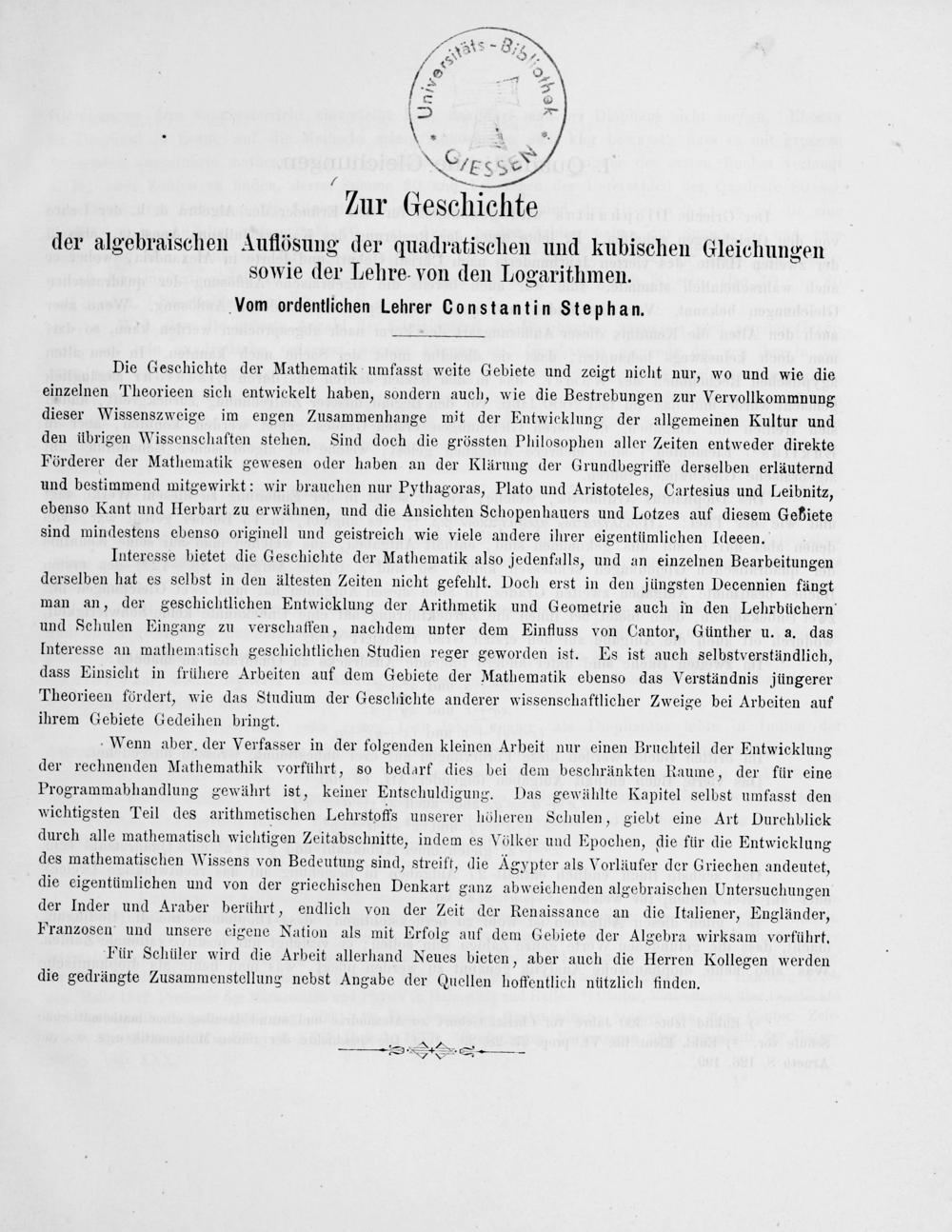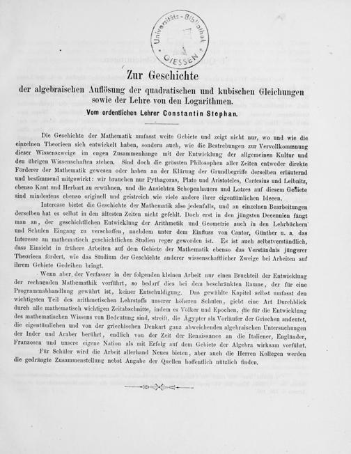 Wenn aber. der Verfasser in der folgenden kleinen Arbeit nur einen Bruchteil der Entwicklung der rechnenden Mathemathik vorführt, so bedarf dies bei dem beschränkten Raume, der für eine Programmabhandlung gewährt ist, keiner Entschuldigung. Das gewählte Kapitel selbst umfasst den wichtigsten Teil des arithmetischen Lehrstoffs unserer höheren Schulen, giebt eine Art Durchblick durch alle mathematisch wichtigen Zeitabschnitte, indem es Völker und E Pochen, die für die Entwicklung des mathematischen Wissens von Bedeutung sind, streift, die Agypter als Vorläufer der Griechen andeutet, die eigentümlichen und von der griechischen Denkart ganz abweichenden algebraischen Untersuchungen der Inder und Araber berührt, endlich von der Zeit der Renaissance an die Italiener, Engländer, Franzosen und unsere eigene Natiom als mit Erfolg auf dem Gebiete der Algebra wirksam vorführt.