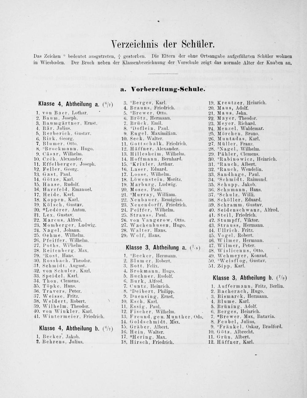 Das Zeichen“* bedeutet ausgetreten, † gestorben. Die Eltern der ohne Ortsangabe aufgeführten Schüler wohnen in Wiesbaden. Der Bruch neben der Klassenbezeichnung der Vorschule zeigt das normale Alter der Knaben an.
