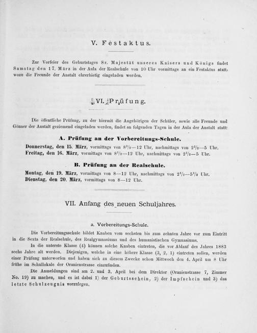 In die unterste Klasse(4) können solche Knaben eintreten, die vor Ablauf des Jahres 1883 sechs Jahre alt werden. Diejenigen, welche in eine höhere Klasse(3, 2, 1) eintreten sollen, werden einer Prüfung unterworfen und haben sich zu diesem Zwecke schon Mittwoch den 4. April um 8 Uhr frühe im Schullokale der Oranienstrasse einzufinden.