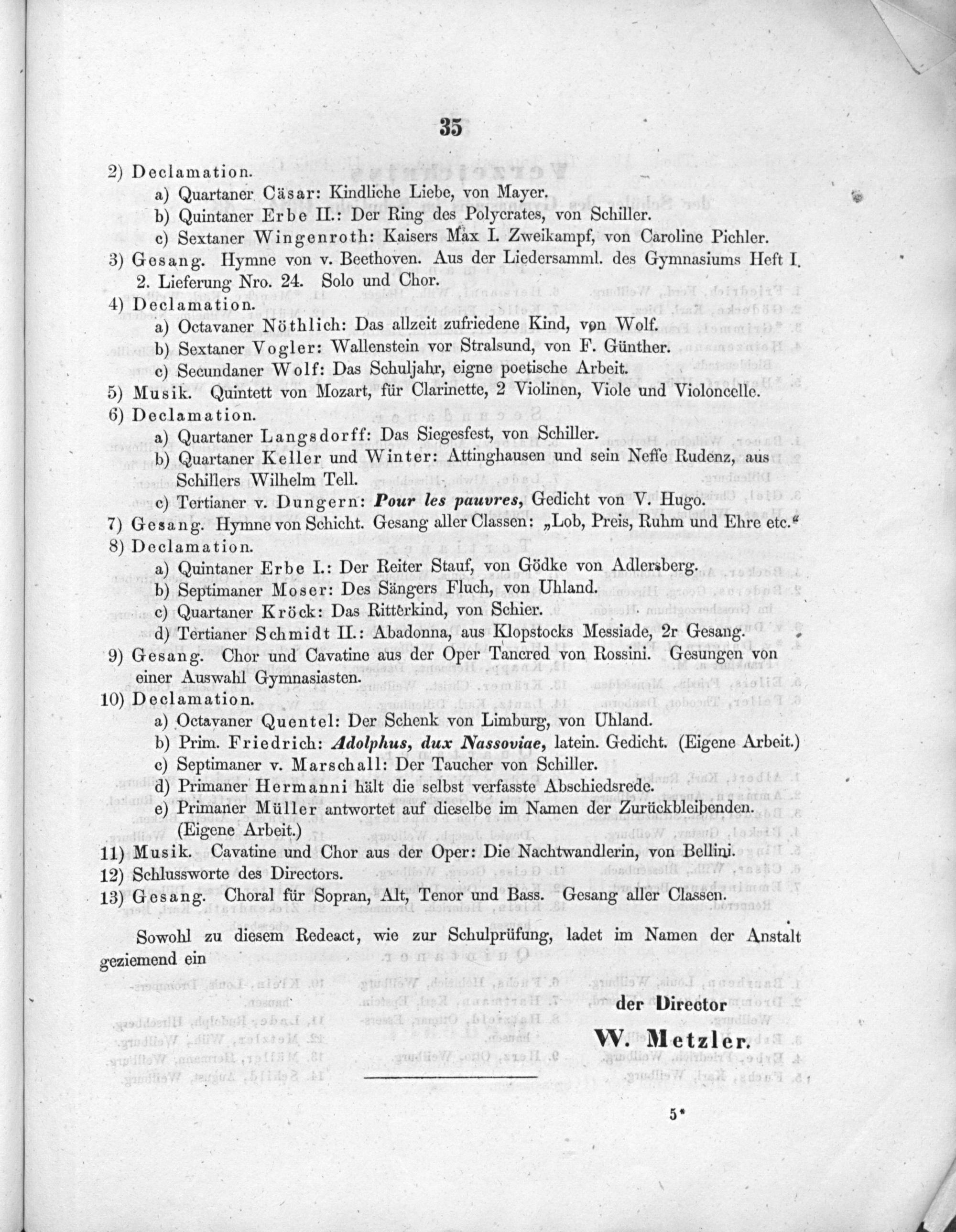 2) Declamation.. a) Quartaner Cäsar: Kindliche Liebe, von Mayer. 2 b) Quintaner Erbe II.: Der Ring des Polycrates, von Schiller. c) Sextaner Wingenroth: Kaisers Max I. Zweikampf, von Caroline Pichler. 3) Gesang. Hymne von v. Beethoven. Aus der Liedersamml. des Gymnasiums Heft I. 2. Lieferung Nro. 24. Solo und Chor. 4) Declamation. a) Octavaner Nöthlich: Das allzeit zufriedene Kind, von Wolkf. b) Sextaner Vogler: Wallenstein vor Stralsund, von F. Günther. c) Secundaner Wolf: Das Schuljahr, eigne poetische Arbeit. 5) Musik. Quintett von Mozart, für Clarinette, 2 Violinen, Viole und Violoncelle. 6) Declamation. a) Quartaner Langsdorff: Das Siegesfest, von Schiller. b) Quartaner Keller und Winter: Attinghausen und sein Neflfe Rudenz, aus Schillers Wilhelm Tell. c) Tertianer v. Dungern: Pour les pauvres, Gedicht von V. Hugo. 7) Gesang. Hymne von Schicht. Gesang aller Classen:„Lob, Preis, Ruhm und Ehre etc.“ 8) Declamation. a) Quintaner Erbe I.: Der Reiter Stauf, von Gödke von Adlersberg. b) Septimaner Moser: Des Sängers Fluch, von Uhland. c) Quartaner Kröck: Das Rittèrkind, von Schier. d) Tertianer Schmidt II.: Abadonna, aus Klopstocks Messiade, 2r Gesang.. 9) Gesang. Chor und Cavatine aus der Oper Tanered von Rossini. Gesungen von einer Auswahl Gymnasiasten. 10) Declamation. a) Octavaner Quentel: Der Schenk von Limburg, von Uhland. b) Prim. Friedrich: Adolphus, dux Nassoviae, latein. Gedicht.(Eigene Arbeit.) c) Septimaner v. Marschall: Der Taucher von Schiller. d) Primaner Hermanni hält die selbst verfasste Abschiedsrede. e) Primaner Müller antwortet auf dieselbe im Namen der Zurückbleibenden. (Eigene Arbeit.) 11) Musik. Cavatine und Chor aus der Oper: Die Nachtwandlerin, von Bellini. 12) Schlussworte des Directors. 13) Gesang. Choral für Sopran, Alt, Tenor und Bass. Gesang aller Classen.