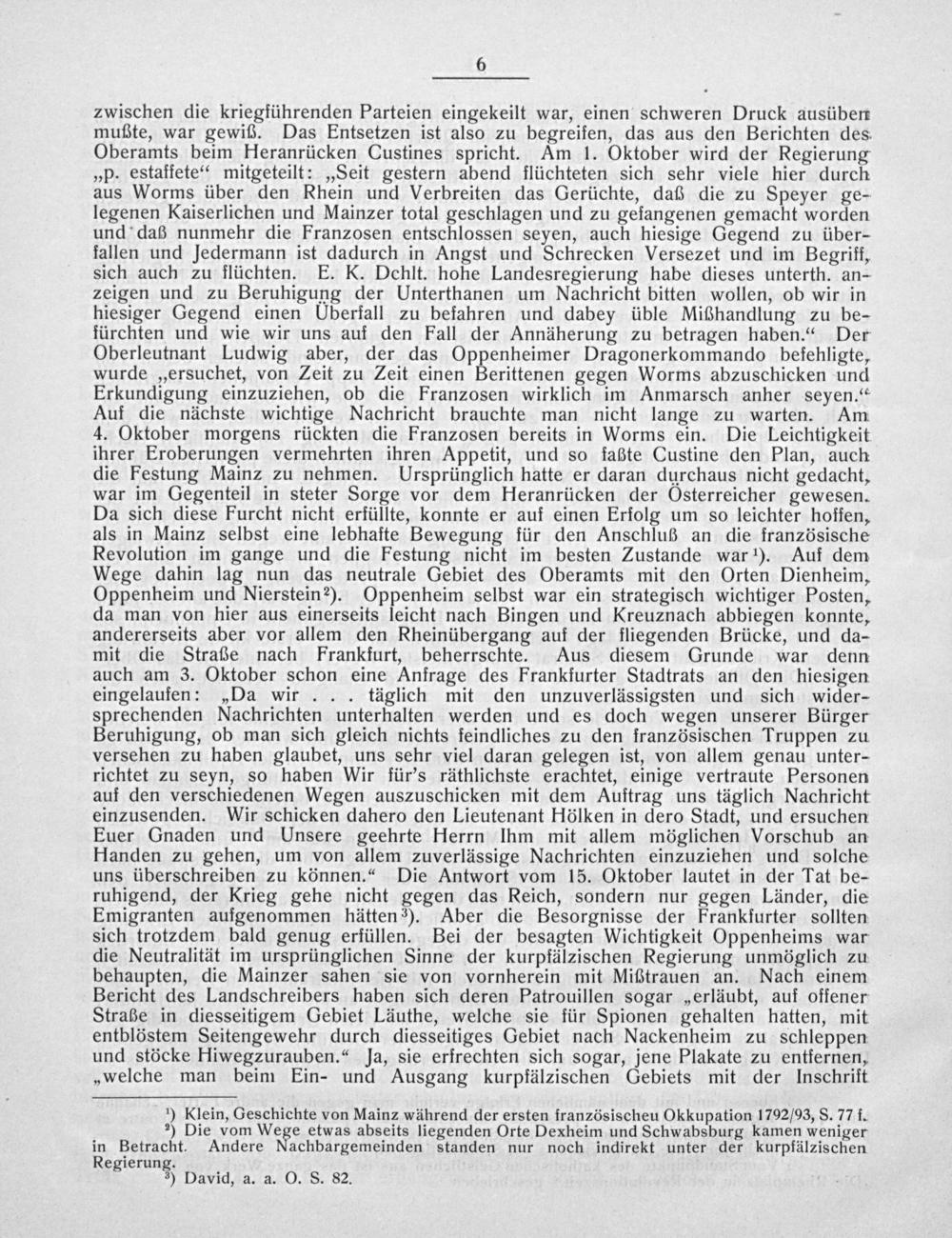 zwischen die kriegführenden Parteien eingekeilt war, einen schweren Druck ausüben mußte, war gewiß. Das Entsetzen ist also zu begreifen, das aus den Berichten des. Oberamts beim Heranrücken Custines spricht. Am 1. Oktober wird der Regierung „p. estaffete“ mitgeteilt:„Seit gestern abend flüchteten sich sehr viele hier durch aus Worms über den Rhein und Verbreiten das Gerüchte, daß die zu Speyer ge- legenen Kaiserlichen und Mainzer total geschlagen und zu gefangenen gemacht worden und daß nunmehr die Franzosen entschlossen seyen, auch hiesige Gegend zu über- fallen und Jedermann ist dadurch in Angst und Schrecken Versezet und im Begriff, sich auch zu flüchten. E. K. Dchlt. hohe Landesregierung habe dieses unterth. an- zeigen und zu Beruhigung der Unterthanen um Nachricht bitten wollen, ob wir in hiesiger Gegend einen Uberfall zu befahren und dabey üble Mißhandlung zu be- fürchten und wie wir uns auf den Fall der Annäherung zu betragen haben.“ Der Oberleutnant Ludwig aber, der das Oppenheimer Dragonerkommando befehligte, wurde„ersuchet, von Zeit zu Zeit einen Berittenen gegen Worms abzuschicken und Erkundigung einzuziehen, ob die Franzosen wirklich im Anmarsch anher seyen.“ Auf die nächste wichtige Nachricht brauchte man nicht lange zu warten. Am 4. Oktober morgens rückten die Franzosen bereits in Worms ein. Die Leichtigkeit ihrer Eroberungen vermehrten ihren Appetit, und so faßte Custine den Plan, auch die Festung Mainz zu nehmen. Ursprünglich hatte er daran durchaus nicht gedacht, war im Gegenteil in steter Sorge vor dem Heranrücken der Osterreicher gewesen. Da sich diese Furcht nicht erfüllte, konnte er auf einen Erfolg um so leichter hoffen, als in Mainz selbst eine lebhafte Bewegung für den Anschluß an die französische Revolution im gange und die Festung nicht im besten Zustande war ¹). Auf dem Wege dahin lag nun das neutrale Gebiet des Oberamts mit den Orten Dienheim, Oppenheim und Nierstein2). Oppenheim selbst war ein strategisch wichtiger Posten, da man von hier aus einerseits leicht nach Bingen und Kreuznach abbiegen konnte, andererseits aber vor allem den Rheinübergang auf der fliegenden Brücke, und da- mit die Straße nach Frankfurt, beherrschte. Aus diesem Grunde war denn auch am 3. Oktober schon eine Anfrage des Frankfurter Stadtrats an den hiesigen eingelaufen:„Da wir... täglich mit den unzuverlässigsten und sich wider- sprechenden Nachrichten unterhalten werden und es doch wegen unserer Bürger Beruhigung, ob man sich gleich nichts feindliches zu den französischen Truppen zu versehen zu haben glaubet, uns sehr viel daran gelegen ist, von allem genau unter- richtet zu seyn, so haben Wir für's räthlichste erachtet, einige vertraute Personen auf den verschiedenen Wegen auszuschicken mit dem Auftrag uns täglich Nachricht einzusenden. Wir schicken dahero den Lieutenant Hölken in dero Stadt, und ersuchen Euer Gnaden und Unsere geehrte Herrn Ihm mit allem möglichen Vorschub an Handen zu gehen, um von allem zuverlässige Nachrichten einzuziehen und solche uns überschreiben zu können.“ Die Antwort vom 15. Oktober lautet in der Tat be- ruhigend, der Krieg gehe nicht gegen das Reich, sondern nur gegen Länder, die Emigranten aufgenommen hätten ³). Aber die Besorgnisse der Frankfurter sollten sich trotzdem bald genug erfüllen. Bei der besagten Wichtigkeit Oppenheims war die Neutralität im ursprünglichen Sinne der kurpfälzischen Regierung unmöglich zu behaupten, die Mainzer sahen sie von vornherein mit Mißtrauen an. Nach einem Bericht des Landschreibers haben sich deren Patrouillen sogar„erläubt, auf offener Straße in diesseitigem Gebiet Läuthe, welche sie für Spionen gehalten hatten, mit entblöstem Seitengewehr durch diesseitiges Gebiet nach Nackenheim zu schleppen und stöcke Hiwegzurauben.“ jJa, sie erfrechten sich sogar, jene Plakate zu entfernen, „welche man beim Ein- und Ausgang kurpfälzischen Gebiets mit der Inschrift