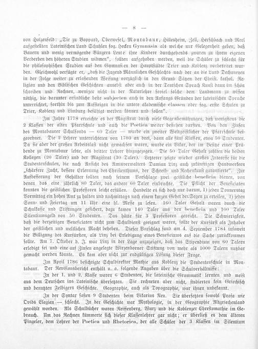 Im Jahre 1778 erreichte es der Magiſtrat durch viele Gegenbemühungen, daß wenigſtens die 2 Klaſſen der alten Pfarrſchule und auch die Poetiéa weiter beſtehen durften. Von den Zinſen des Montabaurer Schulfonds— 60 Taler— wurde ein zweiter Weltgeiſtlicher der Pfarrſchule bei⸗ geordnet. Die 2 Lehrer unterrichteten von 1780 an drei, dann alle fünf Klaſſen, etwa 50 Studenten. Da ſie aber der großen Arbeitslaſt nicht gewachſen waren, wurde ein Vikar, der im Beſitze einer Prä⸗ bende zu Montabaur lebte, als dritter Lehrer hinzugezogen. Die 50 Taler Gehalt zahlten die beiden Kollegen(20 Taler) und der Magiſtrat(30 Taler). Letzterer zeigte wieder großes Intereſſe für die Studentenſchulen, die nach Anſicht des Amtsverwalters Damian Linz auch zukünftigen Handwerkern „ſchärfere Zucht, beſſere Erlernung des Chriſtenthums, der Schreib⸗ und Rechenkunſt garantierte“. Zur Aufbeſſerung der Gehälter ſollten nach ſeinem Vorſchlage zwei geiſtliche beneſicia dienen, von denen das eine jährlich 80 Taler, das andere 60 Taler einbrachte. Die Pflicht der Beneficiaten konnten die geiſtlichen Profeſſoren leicht erfüllen. Handelte es ſich doch nur darum, 1) jeden Donnerstag Vormittag ein hohes Amt zu halten und nachmittags nach einem kurzen Gebet den Segen zu erteilen, 2) jeden Sonn⸗ und Feiertag um 11 Uhr eine hl. Meſſe zu leſen. 160 Taler Gehalt waren durch die Schulkaſſe und Stiftungen geſichert, dazu kamen 140 Taler aus den beneficia und 100 Taler Silentiumsgeld von 50 Studenten. Das hätte für 3 Profeſſoren gereicht. Die Schyierigkeit, daß die derzeitigen Beneficiaten nicht zum Schuldienſt geeignet waren, ſollte der Kurfürſt als Inhaber der geiſtlichen und weltlichen Macht beheben. Dieſer Vorſchlag fand am 4. September 1784 inſoweit die Billigung des Kurfürſten, als Linz bei Erledigung eines Beneficiums auf die Sache zurückkommen ſollte. Am 7. Oktober d. J. war Linz in der Lage anzuzeigen, daß das Stipendium von 60 Talern erledigt ſei und eine auf Zinſen angelegte Wirzenborner Stiftung von mehr als 1000 Talern nutzbar gemacht werden könnte. Es kam aber nicht zur endgültigen Löſung dieſer Frage.