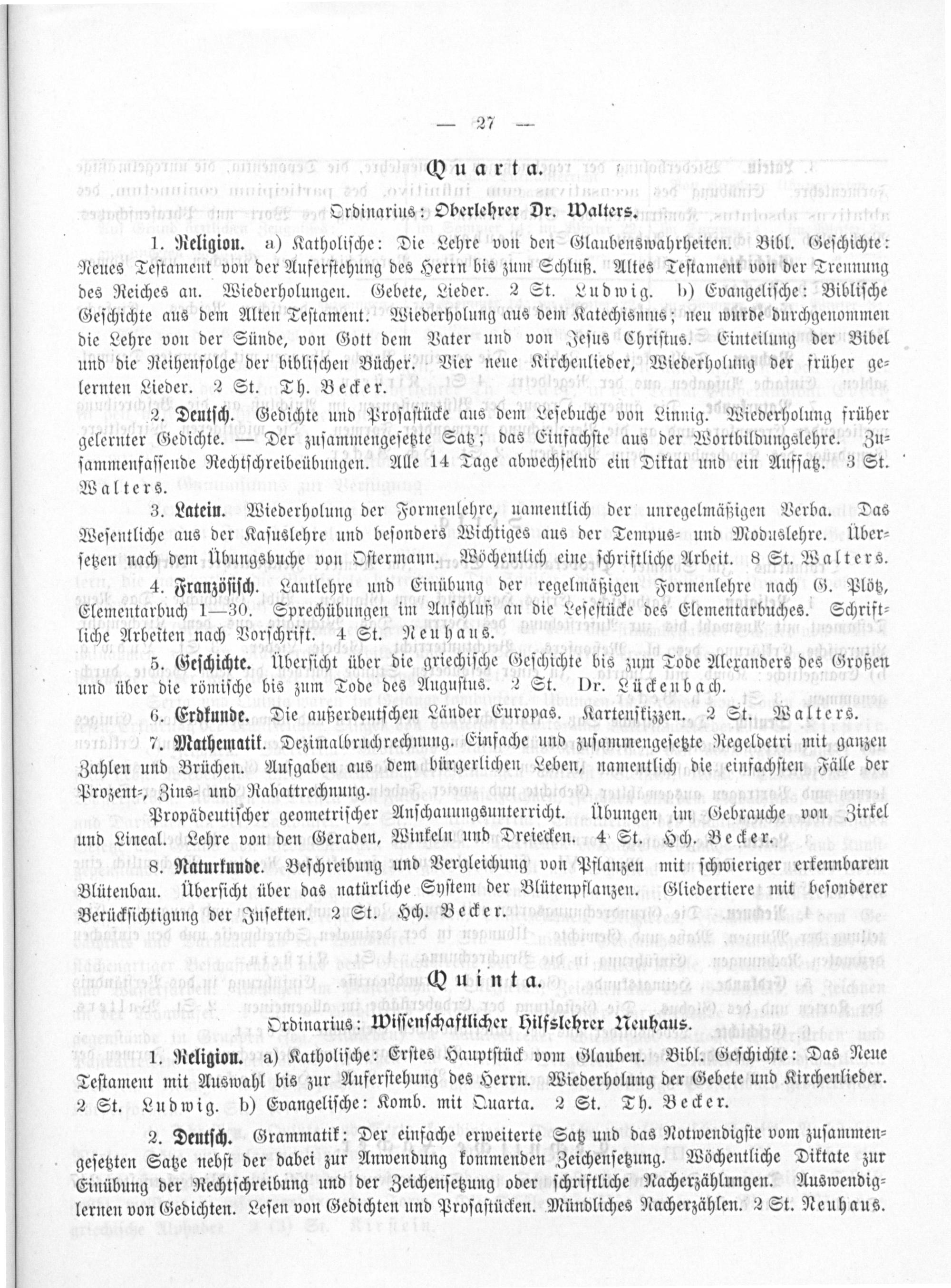 Ordinarius: Oberlehrer Dr. Walters.
