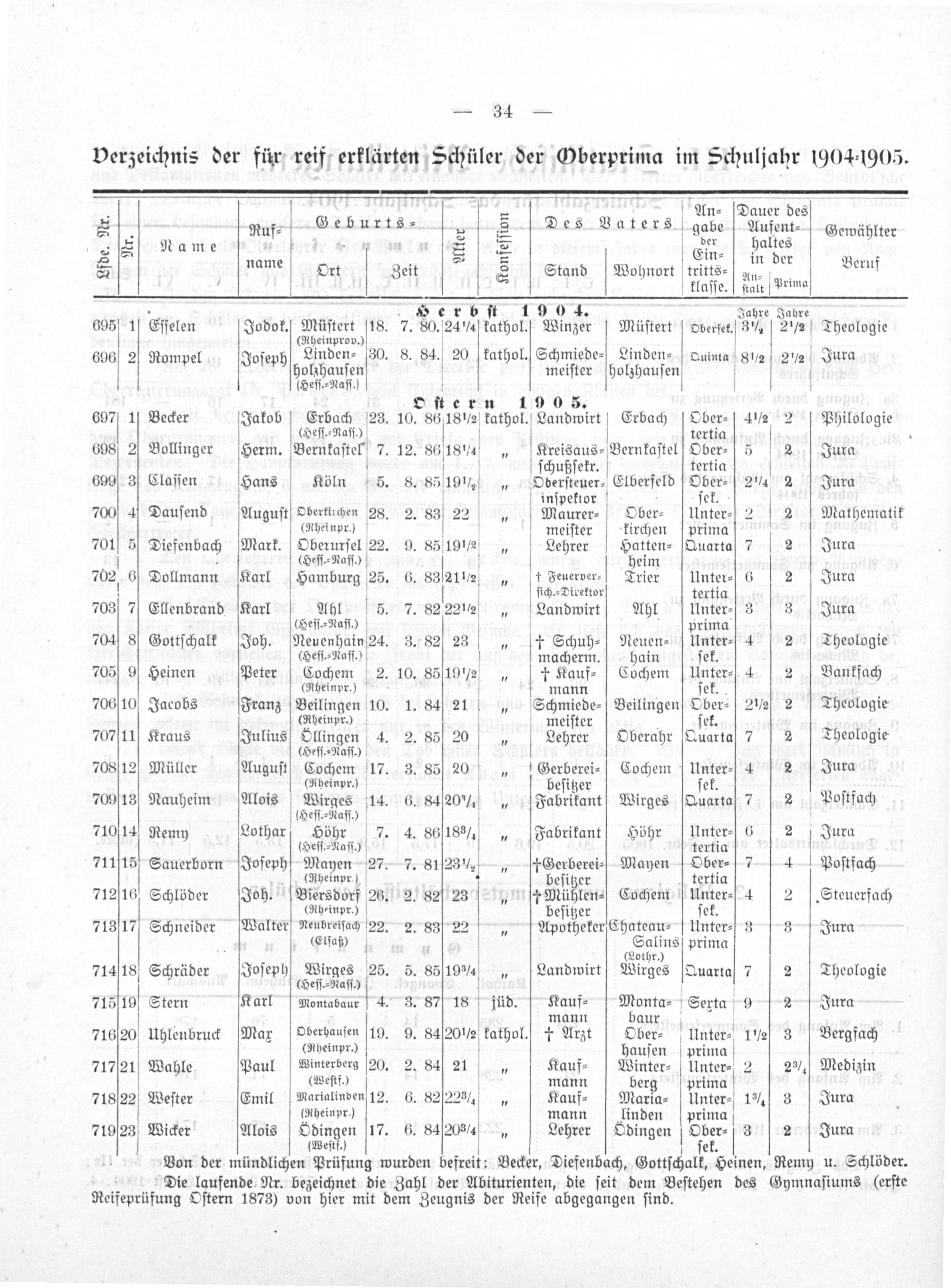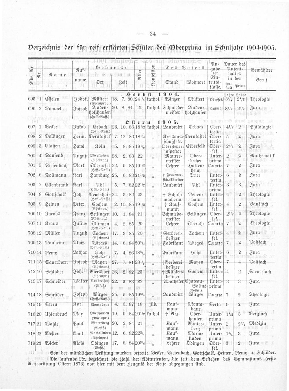 . An⸗ Dauer des „ Ruf⸗ Geburts⸗ 2 5 Des Vaters V gabe Aufent⸗ Gewählter „☛ Name. V— halies ‿. 2 5 Boruf S name Ort Zeit 5 Stand Wohnort tritts⸗ A1 4 Veruf - klaſſe. ſtalt Prima . Herbſt 1904. Jahre Jahre 695 1] Eſſelen Jodok. Müſſgeit 18. 7. 80. 24 ³¾ kathol. Winzer Müſtert Oberſek. 3 ½ 2 ½] Theologie (Rheinprov.) 96 2 Linden⸗ 30. 8. 84. 20 kathol. Schmiede⸗ Linden⸗ Quinta 8 ½ 2 ½ Jura 6 Roꝛnpel Joſeph holzhauſen 4 meiſter holzhauſen 18 2 2 (Seſſ⸗Raſſ.) Oſtern 1905. 697] 1] Becker Jakob Erbach 23. 10. 86/18 ½ kathol. Landwirt! Erbach Ober⸗] 4 ½ 2 Philologie V(Heſſ.⸗Naſſ.) tertia 698 2 Bollinger Herm. Berytaſtel 7. 12. 8618 ¼½„ Kreisaus⸗Bernkaſtel Ober⸗ 5 2 Jura ſchu tertia 699 3 Claſſen Hans Köln 5. 8. 85 19 ½G„ ſchußſott⸗ Eiberfel Ober⸗ 2 ¼ 2 Jura inſpektor ſek. 700 4 Dauſend Auguſt Obertirchen 28. 2. 831 22„ Maurer⸗ Ober⸗ Unter⸗ 2 2 Mathematik (Rheinpr.) meiſter kirchen prima 701 5 Diefenbach Mark. Oberurſel 22. 9. 85 1918 8 Lehrer Hatten⸗ Quarta 7 2 Jura .(Heſſ.⸗Naſſ.) V heim 702 6 Dollmann Karl Hamburg 25. 6. 83 21 ½„ Feuerver⸗ Trier Unter⸗ 6 2 Jura ſich.⸗Direktor tertia 703 7 Ellenbrand Karl Ahl 5. 7. 82 22 ½„ Landwirt Ahl Unter⸗ 3 3 Jura (Heſſ.⸗Naſſ.) prima 704° 8 Gottſchalk Joh. Neuenhain 24. 3. 82) 23„ † Schuh⸗ Neuen⸗ Unter⸗ 4 2 Theologie (Heſſ.⸗Naſſ.) macherm. hain ſek. 705 9 Heinen Peter Cochem 2. 10. 85/19 ½„ † Kauf⸗ Cochem Unter⸗ 4 2 Bankfach (Rheinpr.) mann ſek. 70610 Jacobs Franz Beilingen 10. 1. 84 211„ Schmiede⸗ Beilingen Ober⸗ 2 ½ 2 Theologie (Rheinpr.) meiſter ſek. 4. 707/11 Kraus Julius Ollingen 4. 2. 85 20„ Lehrer Oberahr Quarta 7 2 CTheologie (Heſſ.⸗Naſſ.) 708 12 Müller Auguſt Cochem 17. 3. 85 20„(Gerberei⸗ Cochem Unter⸗ 4 2 Jura (Rheinpr.) beſitzer ſek. 709[13 Nauheim Alois Wirhes 14. 6. 84 20„ Fabrikant Wirges Quarta 7 2 Poſtfach Heſſ.⸗Naſſ.) 710 ʃ14 Remy Lothar Höhr 7. 4. 8618 ¾„ Fabrikant Höhr Unter⸗ 6 2 Jura (Heſſ.⸗Naſſ.) tertia 711 15 Sauerborn Joſephh Mayen 27. 7. 81/ 23 ½„ Gerberei⸗ Mayen Ober⸗ 7 4 Poſtfach (Rheinpr.) beſitzer tertia 71216] Schlöder Joh. Biersdorf 26. 2. 82 23„ †Mühlen⸗ Cochem Unter⸗ 4 2(Steuerfach (Rheinpr.) beſitzer ſek. 713117] Schneider Walter Neubreiſach 22. 2. 83, 22„ ApothekerChateau⸗ Unter⸗ 3 3— Jura EElſaß)(Lalins prima Lothr.) 71418 Schräder Joſeph(Mirges) 25. 5. 85/19 ¾¾„ Landwirt Wirges(Quarta 7 2 Theologie deſſ.⸗Naſſ. 71519 Stern Karl Montabaur 4. 3. 87 18 jüd. Kauf⸗ Monta⸗ Serta 9 2 Jura mann baur 716 20 Uhlenbruck Max SOberhauſen 19. 9. 84,20 ½ kathol. † Arzt Ober⸗ Unter⸗ 1 ½ 3 Bergfach (Rheinpr.) hauſen prima 717,21 Wahle Paul Winterberg 20. 2. 84 21„ Kauf⸗ Vinter⸗ Unter⸗ 2 2% Medizin (Weſtf.) mann berg prima 71822 Weſter Emil Marialinden 12. 6. 82 223 ¾¼„ Kauf⸗ Maria⸗ Unter⸗ 1 ¾ 3 Jura (Rheinpr.) mann linden prima V 719 23 Wicker Alois Odingen 17. 6. 84 20 à„ Lehrer Odingen Sbere ha 2 Jura (Weſtf