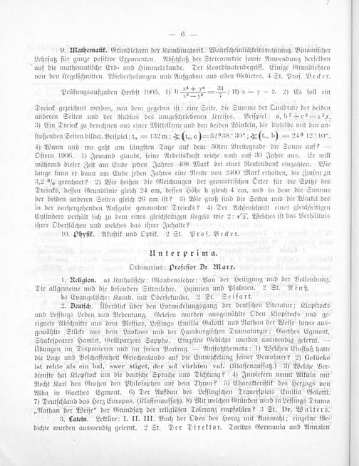 9. Mathematik. Grundlehren der Kombinatorik. Wahrſcheinlichkeitsrechnung. Binomiſcher Lehrſatz für ganze poſitive Exponenten. Abſchluß der Stereometrie ſowie Anwendung derſelben auf die mathematiſche Erd⸗ und Himmelskunde. Der Koordinatenbegriff. Einige Grundlehren von den Kegelſchnitten. Wiederholungen und Aufgaben aus allen Gebieten. 4 St. Prof. Becker.