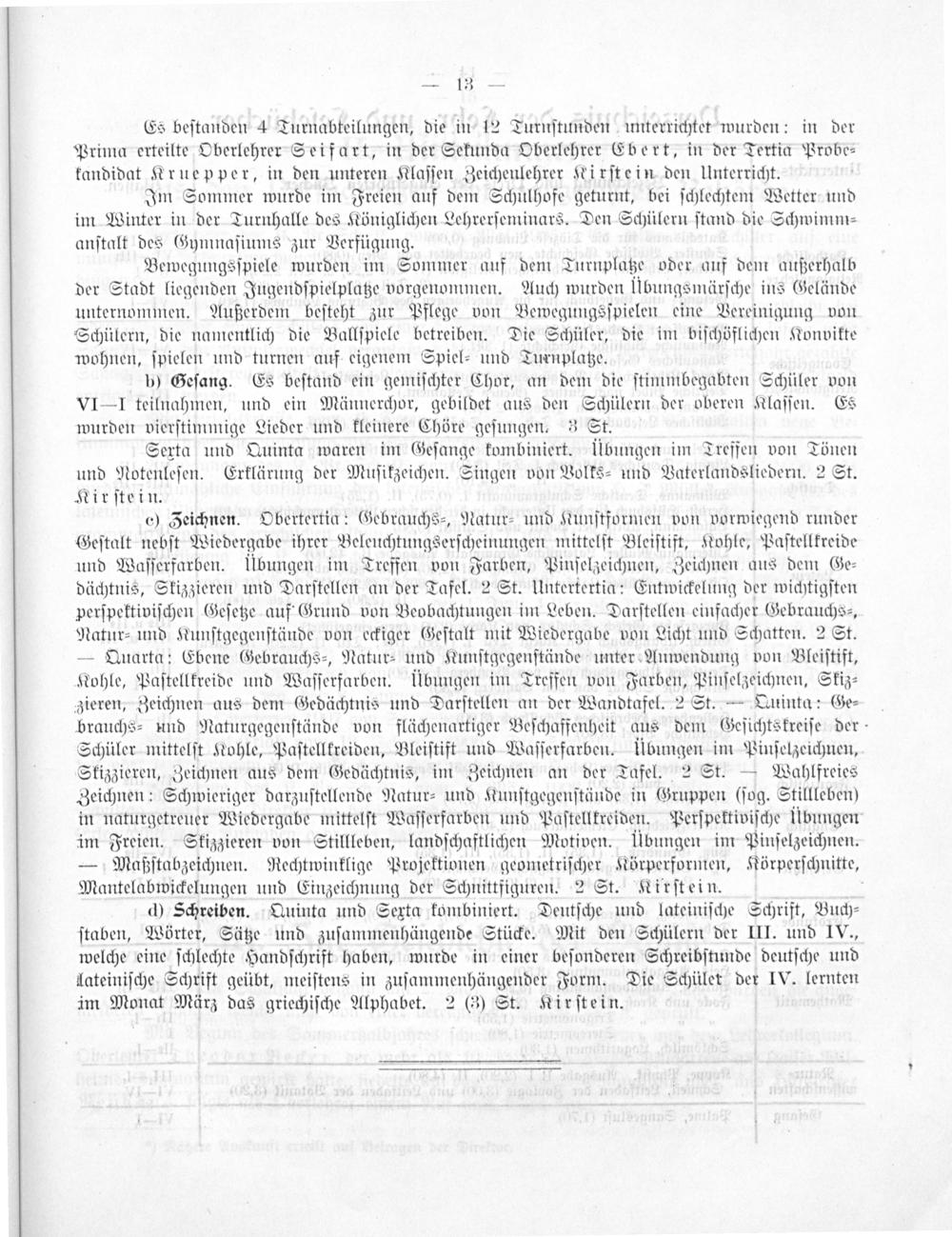 d) Schreiben. Quinta und Sexta kombiniert. Deutſche und lateiniſche Schrift, Buch⸗ ſtaben, Wörter, Sätze und zuſammenhängende Stücke. Mit den Schülern der III. und IV., welche eine ſchlechte Handſchrift haben, wurde in einer beſonderen Schreibſtunde deutſche und lateiniſche Schrift geübt, meiſtens in zuſammenhängender Form. Die Schület der IV. lernten im Monat März das griechiſche Alphabet. 2(3) St. Kirſtein.
