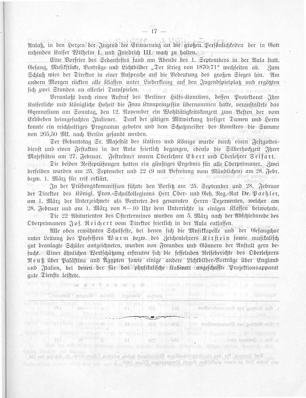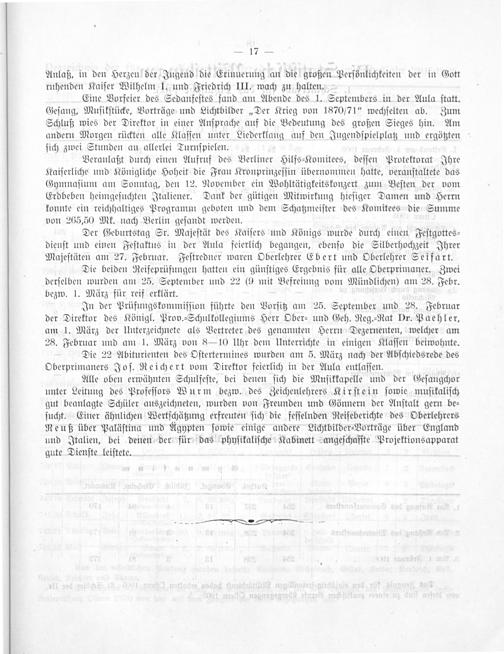 Die beiden Reifeprüfungen hatten ein günſtiges Ergebnis für alle Oberprimaner. Zwei derſelben wurden am 25. September und 22(9 mit Befreiung vom Mündlichen) am 28. Febr. bezw. 1. März für reif erklärt.