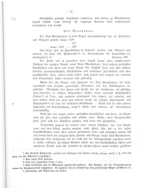 Die Stat Monthabaur in irem Begrif hernachbeſtimpt hat an Feurſteten und Burgern gehabt Anno 1478 271 unno 1548... 290 Hat dieſer Zeit an Feuerſtedten ſo bewonet werden von Burgern und witwen, die Stat 197, Pfaffenacker²) 41, Armenhauſen 29, Saurenthal 22, Horhauſen ³) 1 Summa 300 Die Stadt mit itz gemeltem irem begriff ſampt allen nachbenanten Dörffern des gantzen Ampts unnd Bans Monthabaur, ſeint unſerm gnedigſten Churfürſten und Hern und ſeiner Churf. Gn. Ertzſtift Trier mit aller Hoheit, oberkeit, gruntgerechtigkeit, Chriſtlichenn und weltlichen Jurisdiktion und aller gerichtbarkeit hoch, nieder unnd mittel, auch gepott und verpott inn criminal und bürgerlichen ſachen verwant und zuſtendig.