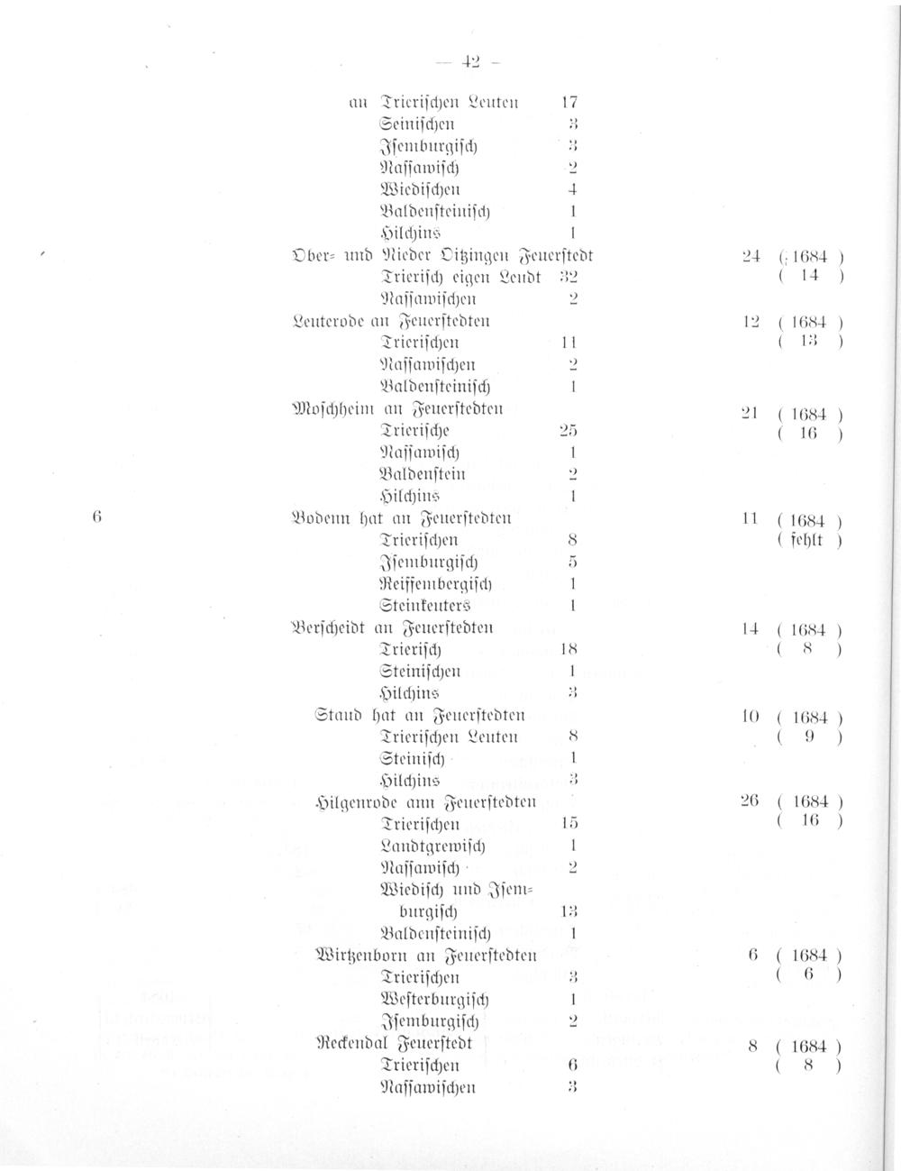 an Trieriſchen Leuten 17 Seiniſchen 3 Iſemburgiſch 3 Naſſawiſch 2 Wiediſchen 4 Baldenſteiniſch 1 Hilchins Ober⸗ und Nieder Oitzingen Feuerſtedt 24(1684) Trieriſch eigen Leudt 32 614) Naſſawiſchen 2 Leuterode an Feuerſtedten 12(1684) Trieriſchen 11 613) Naſſawiſchen 2 Baldenſteiniſch G Moſchheim an Feuerſtedten 21(1684) Trieriſche 25(16) Naſſawiſch 1 Baldenſtein 2 Hilchins 1 6 Bodenn hat an Feuerſtedten 11(1684) Trieriſchen 8 Cfehlt) Iſemburgiſch 5 Reiffembergiſch 1 Steinkeuters 1 Berſcheidt an Feuerſtedten 14(1684) Trieriſch 18 68) Steiniſchen Hilchins 3 Staud hat an Feuerſtedten 10(1684) Trieriſchen Leuten 8(9) Steiniſch 1 Hilchins 3 Hilgenrode ann Feuerſtedten 26(1684) Trieriſchen 15(16) Landtgrewiſch 1 Naſſawiſch: 2 Wiediſch und Iſem⸗ burgiſch 13 Baldenſteiniſch Wirtzenborn an Feuerſtedten 6(1684) Trieriſchen 3 66) Weſterburgiſch 1 Iſemburgiſch 2 Reckendal Feuerſtedt 8(1684) Trieriſchen 6( 8