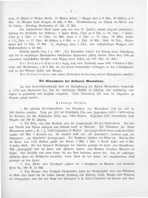 1. Als jährliche Vermögensſteuer der Bewohner von Montabaur ſind hie und da 200 Gulden erwähnt. Noch zur Zeit des Erzbiſchofs Otto von Ziegenhain(1418—1430) betrug die Summe, die alle Schaltjahre fällig war, 1000 Gulden. Erzbiſchof Otto verminderte dieſe Abgabe auf 200 G. jährlich.