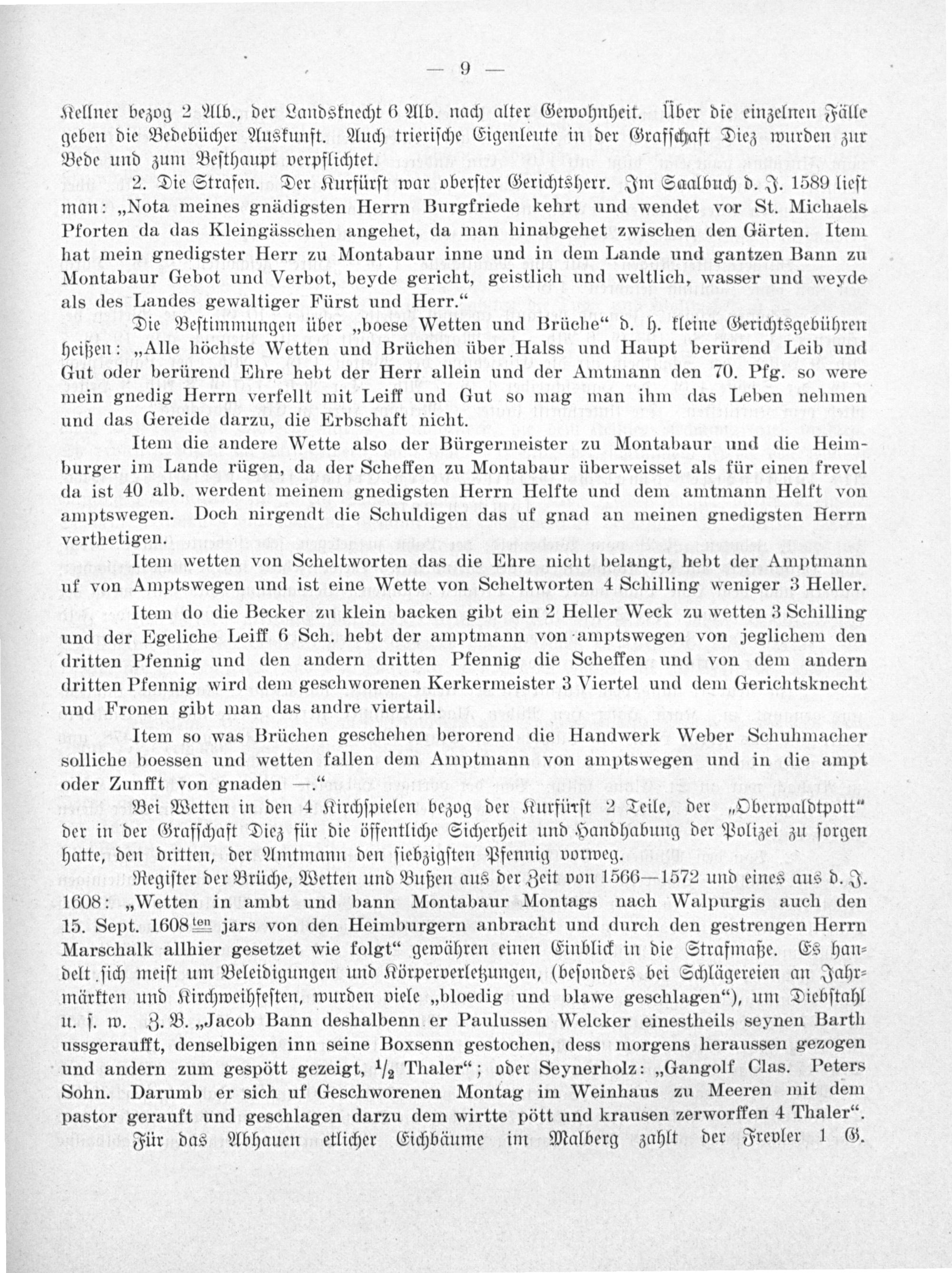 2. Die Strafen. Der Kurfürſt war oberſter Gerichtsherr. Im Saalbuch d. J. 1589 lieſt man:„Nota meines gnädigsten Herrn Burgfriede kehrt und wendet vor St. Michaels Pforten da das Kleingässchen angehet, da man hinabgehet zwischen den Gärten. Item hat mein gnedigster Herr zu Montabaur inne und in dem Lande und gantzen Bann zu Montabaur Gebot und Verbot, beyde gericht, geistlich und weltlich, wasser und weyde als des Landes gewaltiger Fürst und Herr.“
