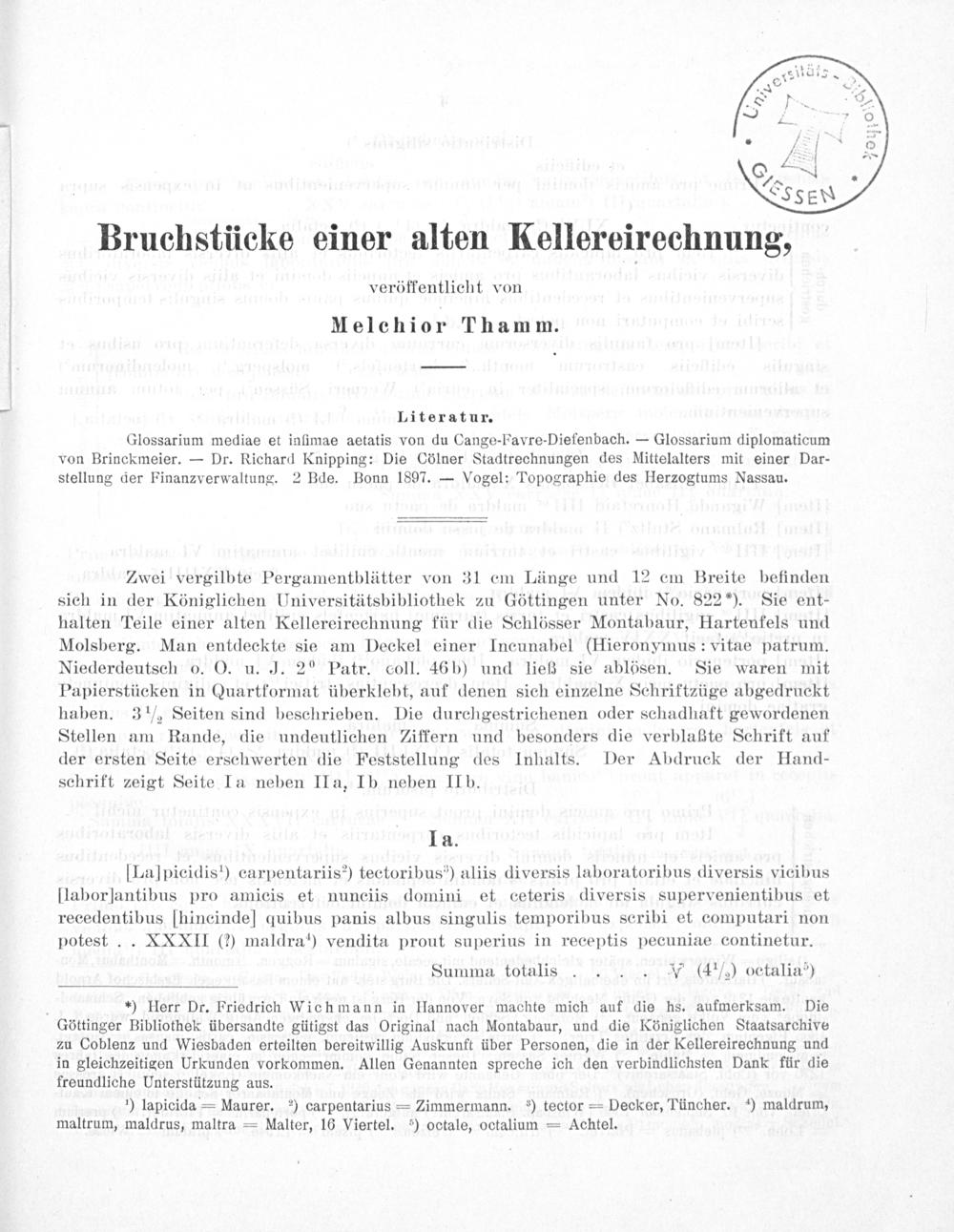 Zwei vergilbte Pergamentblätter von 31 cm Länge und 12 cm Breite befinden sich in der Königlichen Universitätsbibliothek zu Göttingen unter No. 822*). Sie ent- halten Teile einer alten Kellereirechnung für die Schlösser Montabaur, Hartenfels und Molsberg. Man entdeckte sie am Deckel einer Incunabel(Hieronymus: vitae patrum. Niederdeutsch o. O. u. J. 2⁰°pPatr. coll. 46 b) und ließ sie ablösen. Sie waren mit Papierstücken in Quartformat überklebt, auf denen sich einzelne Schriftzüge abgedruckt haben. 3 ½ Seiten sind beschrieben. Die durchgestrichenen oder schadhaft gewordenen Stellen am Rande, die undeutlichen Ziffern und besonders die verblaßte Schrift auf der ersten Seite erschwerten die Feststellung des Inhalts. Der Abdruck der Hand- schrift zeigt Seite Ta neben IIa, Ib neben IIb.