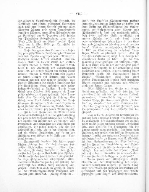 Naturgemäß brachten die letzten preu⸗ ßiſchen Könige den Turnbeſtrebungen das größte Wohlwollen entgegen. Einer ihrer Vorfahren, Friedrich Wilhelm I, der Zucht⸗ meiſter des Preußenvolkes, hatte zwei Pflichten als Grundſäulen ſeines Staates aufgerichtet: die Schulpflicht und die Wehrpflicht. Allen ſpäteren Soldatenkönigen lag die Hebung der Wehrkraft des Volkes durch Erziehung am Herzen. Das kam auch in gewiſſem Sinne bei der Militärorganiſation Wilhelms des Großen zum Ausdruck.„König Wilhelm I.
