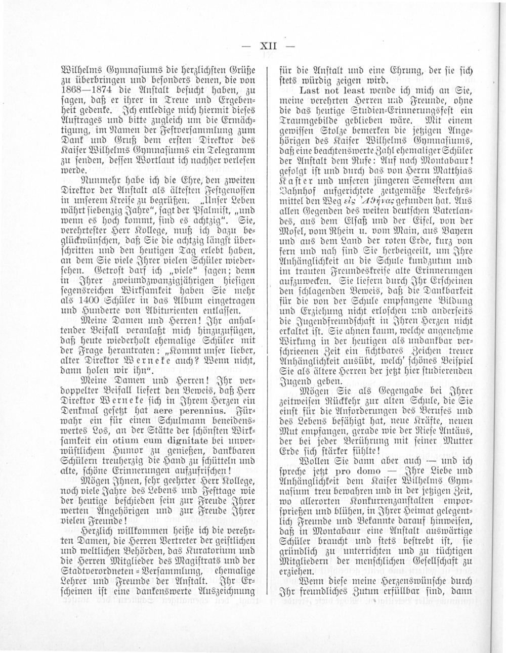 Last not least wende ich mich an Sie, meine verehrten Herren und Freunde, ohne die das heutige Studien⸗Erinnerungsfeſt ein Traumgebilde geblieben wäre. Mit einem gewiſſen Stolze bemerken die jetzigen Ange⸗ hörigen des Kaiſer Wilhelms Gymnaſiums, daß eine beachtenswerte Zahl ehemaliger Schüler der Anſtalt dem Rufe: Auf nach Montabaur! gefolgt iſt und durch das von Herrn Matthias Kaſter und unſeren jüngeren Semeſtern am Bahnhof aufgerichtete zeitgemäße Verkehrs⸗ mittel den Weg als Aoννα‿ gefunden hat. Aus allen Gegenden des weiten deutſchen Vaterlan— des, aus dem Elſaß und der Eifel, von der Moſel, vom Rhein u. vom Main, aus Bayern und aus dem Land der roten Erde, kurz von fern und nah ſind Sie herbeigeeilt, um Ihre Anhänglichkeit an die Schule kundzutun und im trauten Freundeskreiſe alte Erinnerungen aufzuwecken. Sie liefern durch Ihr Erſcheinen