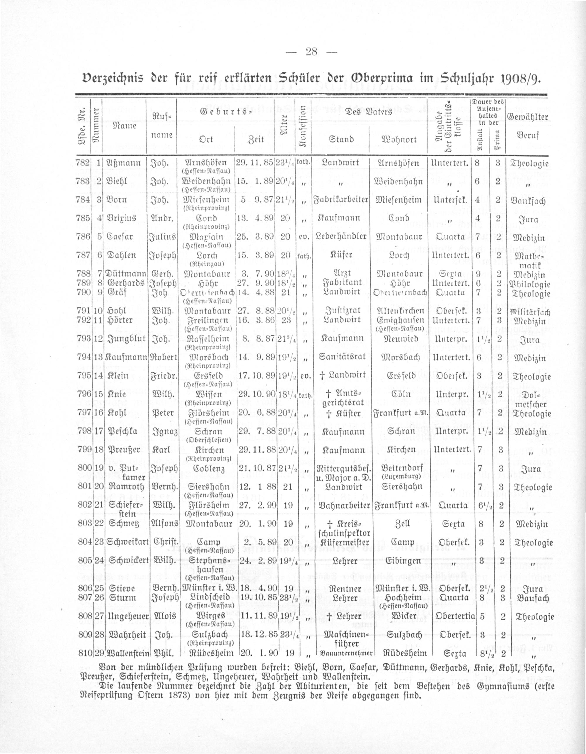 . Daufß des . 2 2 22 Aufent⸗— E Ruf⸗ Geburts⸗. Des Vaters 2, baltes Gewählter Name 5e in der 2= 5=— 8 5= nante Ort Zeit& Stand Wohnort 5 215 Beruf E 8*ι 782 1 Aßmann Joh. Arnshöfen(29. 11. 85 23 fath. Landwirt Arnshöfen Untertert. 8 3 Theologie (Heſſen⸗Naſſau) 783 2 Biehl oh. Weidenhahn(15. 1. 89 20 ¼ 0„— Weidenhahn 6 2 5 J h We denhasn 14 hah 7. 784 3 Born Joh. Miſenhen 5 9,8,217.„ Fabrikarbeiterſ Mieſenheim Unterſek. 4 2 Bankfach (Rheinprovinz 785 4 Brixius Andr. Cond 113. 4. 89 20„ Kaufmann Cond„ 4 2 Jura (Rheinprovinz) 786 5 Caeſar Julius Maxſain 25. 3. 89 20 ev. Lederhändler Montabaur Quarta 7 2 Medizin (Heſſen⸗Naſſau) 787 6 Dahlen Joſeph Lorch 15. 3. 89 20 ſtath. Küfer Lorch Untertert. 6 2 Mathe⸗ (Rheingau) matik 788 7 Düttmann Gerh. Montabaur 3. 7.90 18 ¾„ 8— Arzt Montabaur Sexia 9 2 Medizin 789 8 Gerhards Joſephh Höhr 27. 9. 90 18 ½„ Fabrikant Höhr Untertert. 6 2 Philologie 790 9 Gräf Joh. Oterti fenbach 14. 4. 88 21„ Landwirt Obertieſenbach Quarta 7 2 Theologie (Heſſen⸗Naſſau) 79110 Hohl Wilh. Montabaur 27. 8. 88,20 ½ m„ Juſtizrat Altenkirchen Oberſek. 3 2 wilitärfach 792 11 Hörter Joh. Freilingen 16. 3. 860 23„ Landwirt Cwiabauien Untertert. 7 3 Medizin (Heſſen⸗Naſſau)(Heſſen⸗Naſſau) 793 12 Jungblut Joh. Naſſelheim 8. 8. 87 21 ¾„ Kaufmann Neuwied Unterpr. 1 ½ 2 Jura (Rheinprovinz) 794/13 Kaufmann Robert: Morsbach 14. 9. 89 19 ½ w Sanitätsrat: Morsbach Untertert. 6 2 Medizin (Rheinprovinz) 795/14 Klein Friedr. Ersfeld 17. 10. 89 19 ½ ev. † Landwirt Ersfeld Oberſek. 3 2 Theologie (Heſſen⸗Naſſau) 796/15 Knie Wilh. Wiſſen 29. 10. 90 18 ¼ tath. † Amts⸗ Cöln Unterpr. 1 ½ 2 Dol⸗ (Rheinprovinz) gerichtsrat metſcher 797 16 Kohl Peter Fibrahem 20. 6. 88 20 ¾„† Küſter Frankfurt a.M. Quarta 7 2 CTheologie (Heſſen⸗Naſſau) 798 17 Peſchka Ignaz Schran 29. 7. 88 20 ¾„ Kaufmann Schran Unterpr. 1 ½ 2 Medizin (Oberſchleſien).— 799 18 Preußer Karl Kirchen 29. 11. 88 20 ¼„Kaufmann Kirchen Untertert. 7 3„ (Rheinprovinz) 800 19 v. Punt⸗ Joſephh Coblenz 21. 10. 87 21 ½„ Ritterutabe Hattenrdonf„ 7 3 Jura amer u. Major a. D.(Lux 801 20 Ramroth Bernh. Sierbyu⸗ 12. 1 88 21„ Landwirt Siershahn„ 7 3 Theologie Heſſen⸗Naſſau 802 21 Schiefer⸗ Wilh. Flörsheim 27. 2.90 19„ Bahnarbeiter Frankfurt a.M.] Quarta 6 ½ 2„ ſtein(Heſſen⸗Naſſau). 803, 22 Schmetz Alfons Montabaur 20. 1.90 190„— Kreis⸗ Zell Sexta 8 2 Medizin ſchulinſpektor dee Schweikart Chriſt.(8Caſen) 2. 5. 89 20„ Küfermeiſter Camp Oberſek. 3 2 Theologie 805˙24 Schwickert Wilh. Liafgens. 24. 2. 89 19 ¾„ Lehrer Eibingen 7 3 2 7 (Heſſen⸗Naſſau) 806,25(Stieve Bernh. Münſter i. W.18. 4.90] 19„ Rentner Münſter i. W. Oberſek. 2 ½ 2 Jura 807 26 Sturm Joſeph inſeheid 19. 10. 85,23 ½„ Lehrer Hochhefmn Quarta 8 3 Baufach eſſen⸗Naſſau(Heſſen⸗Naſſau. 808 27 Ungeheuer Alois 6 Frdes) 11.11. 89 19„„+ Lehrer Wicker Obertertia 5 2 Theologie eſſen⸗Naſſau 809 28 Wahrheit Joh. Sulzbach 18. 12.85 23 ¼„ Maſchinen⸗ Sulzbach Oberſek. 3 2 5 (Rheinprovinz) führer 810 29 Wallenſtein Phil.! Rüdesheim 20. 1. 90 19„ Bauunternehmer Rüdesheim! Sexta 8 ½ 2„